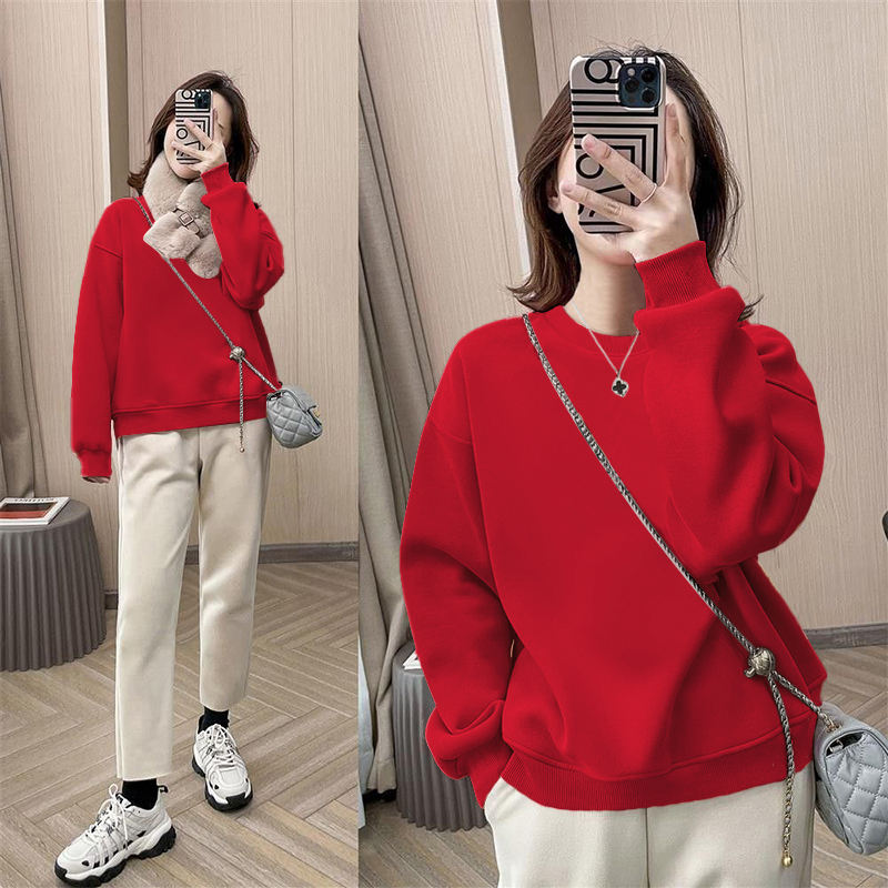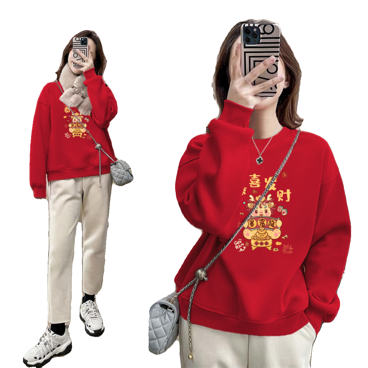 恭喜发财加绒加厚本命年卫衣女高级感时尚印花宽松纯棉正肩外套潮