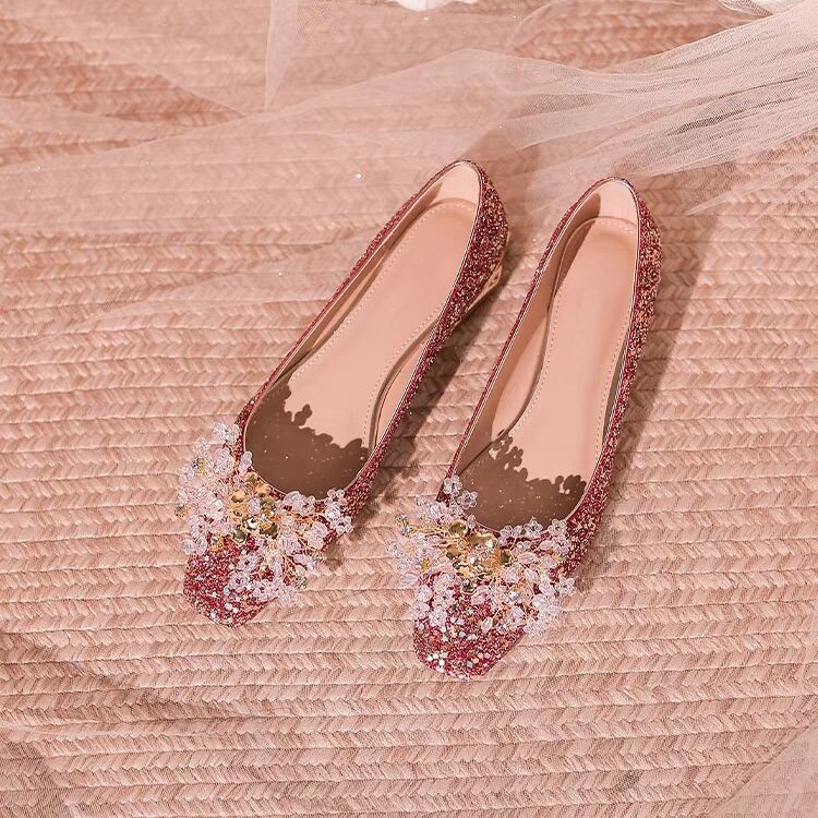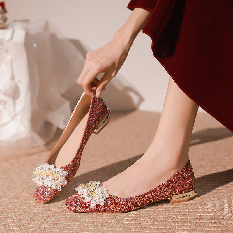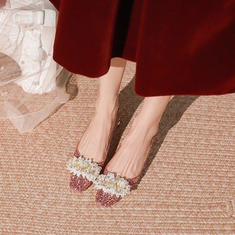 高级感水晶婚鞋女2024年新款小众方头平底红色新娘鞋不累脚敬酒服