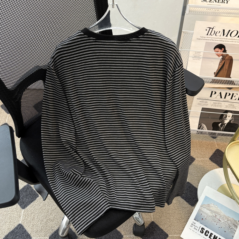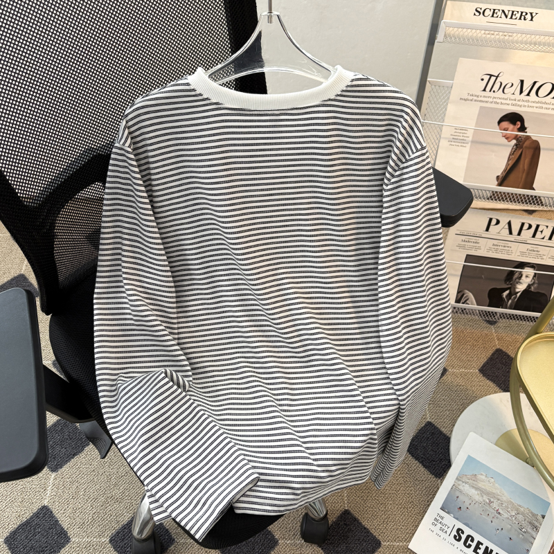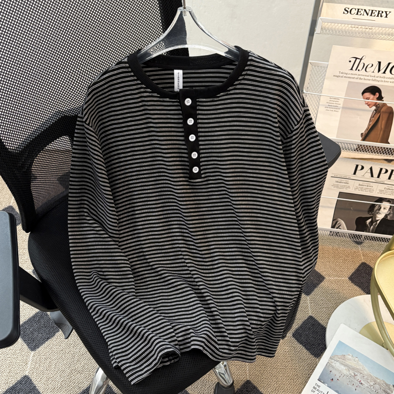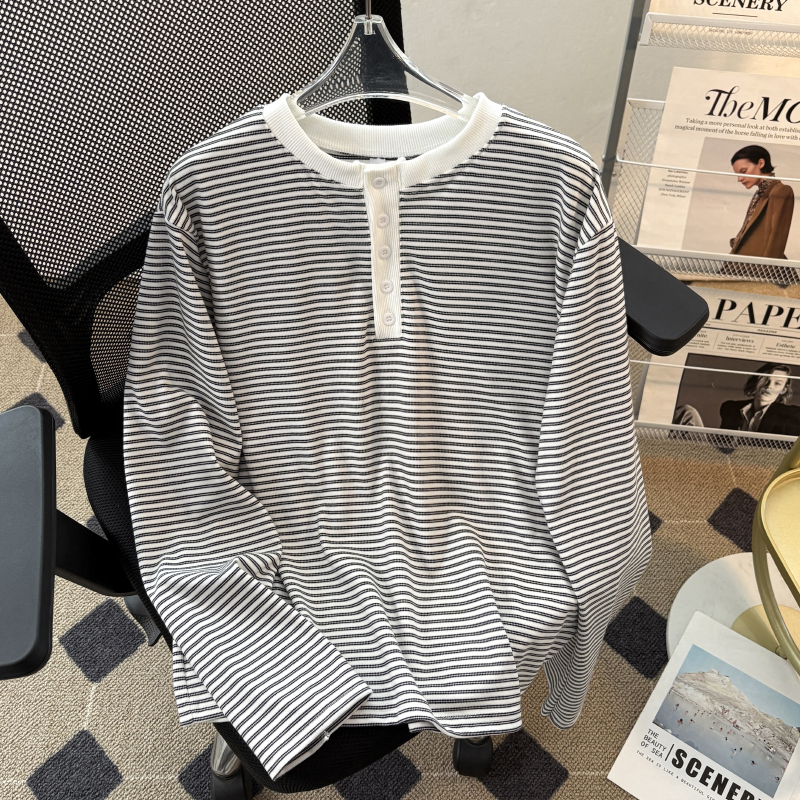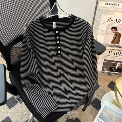 重磅条纹亨利领卫衣男女秋季基础打底衫正肩宽松纯棉长袖T恤上衣