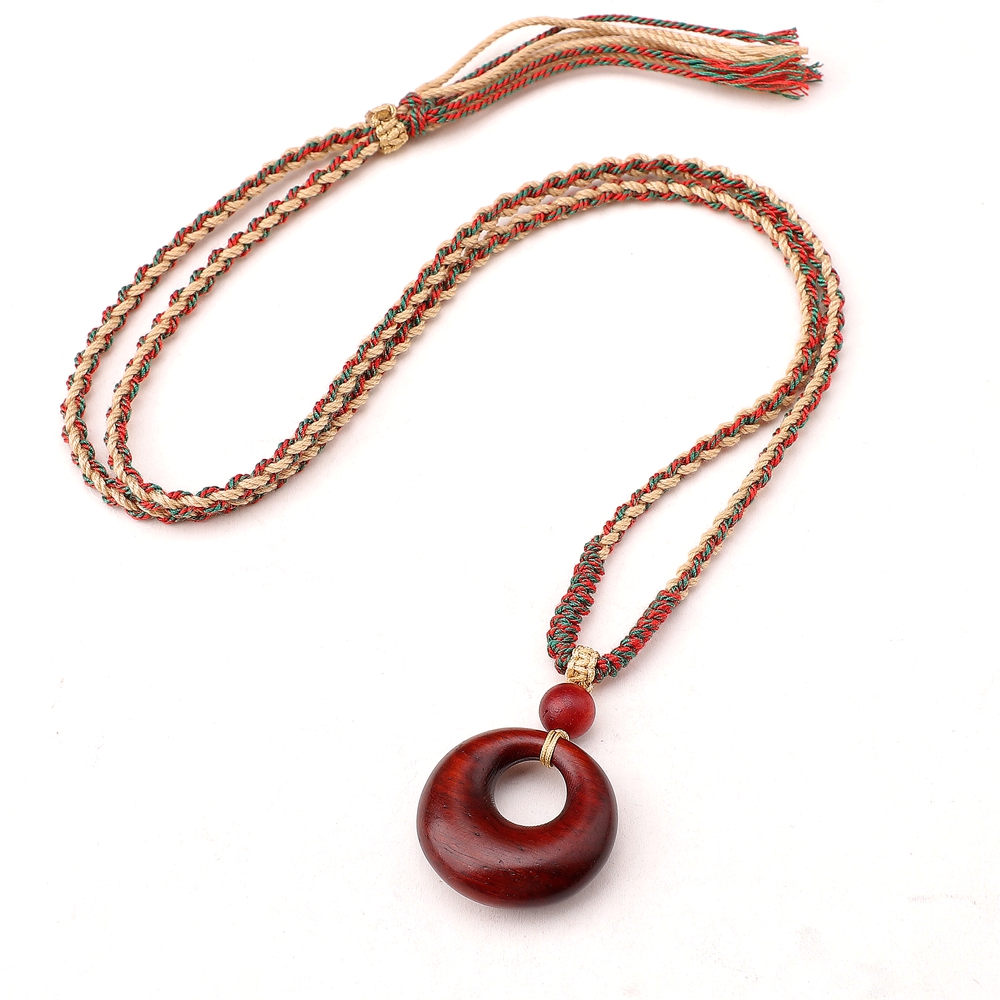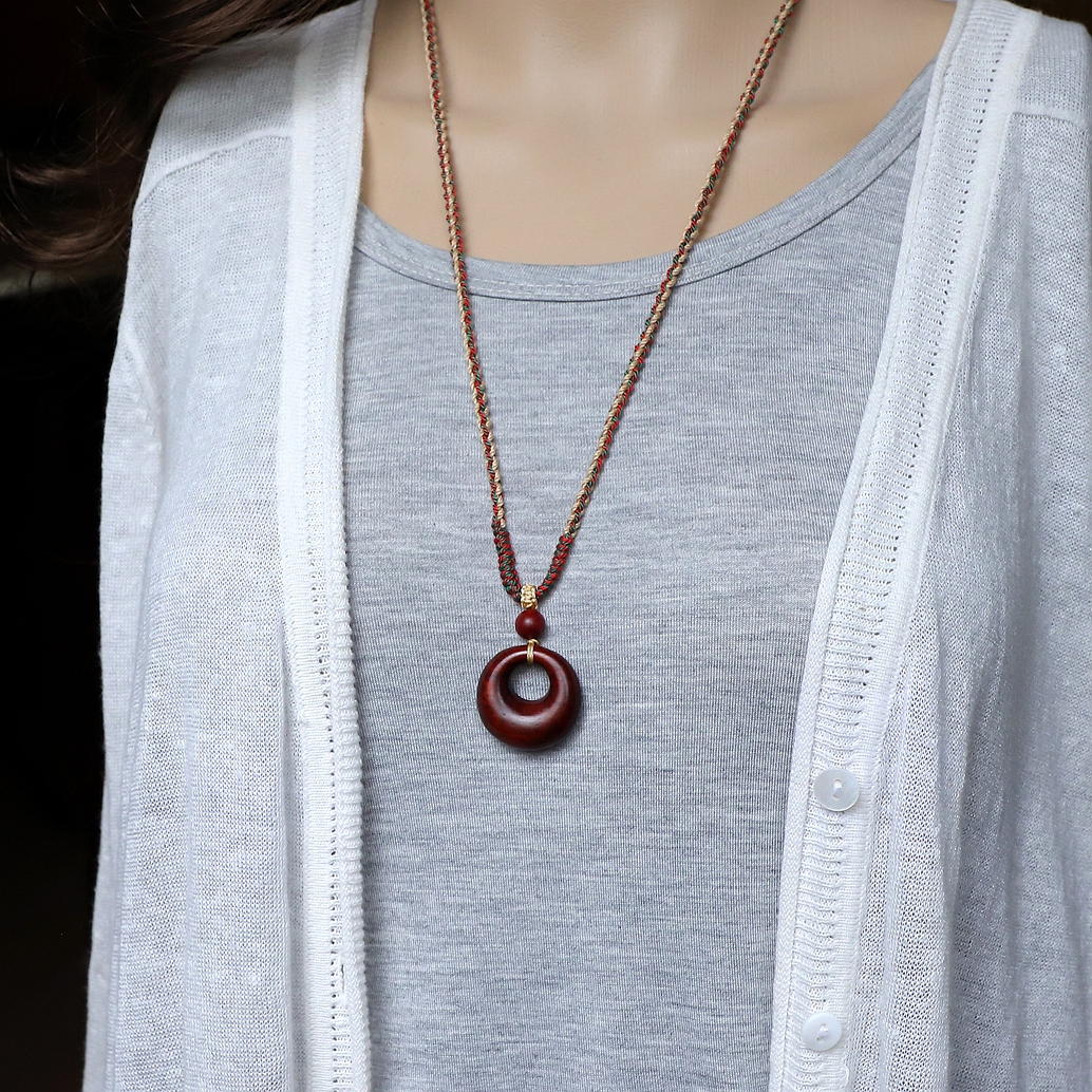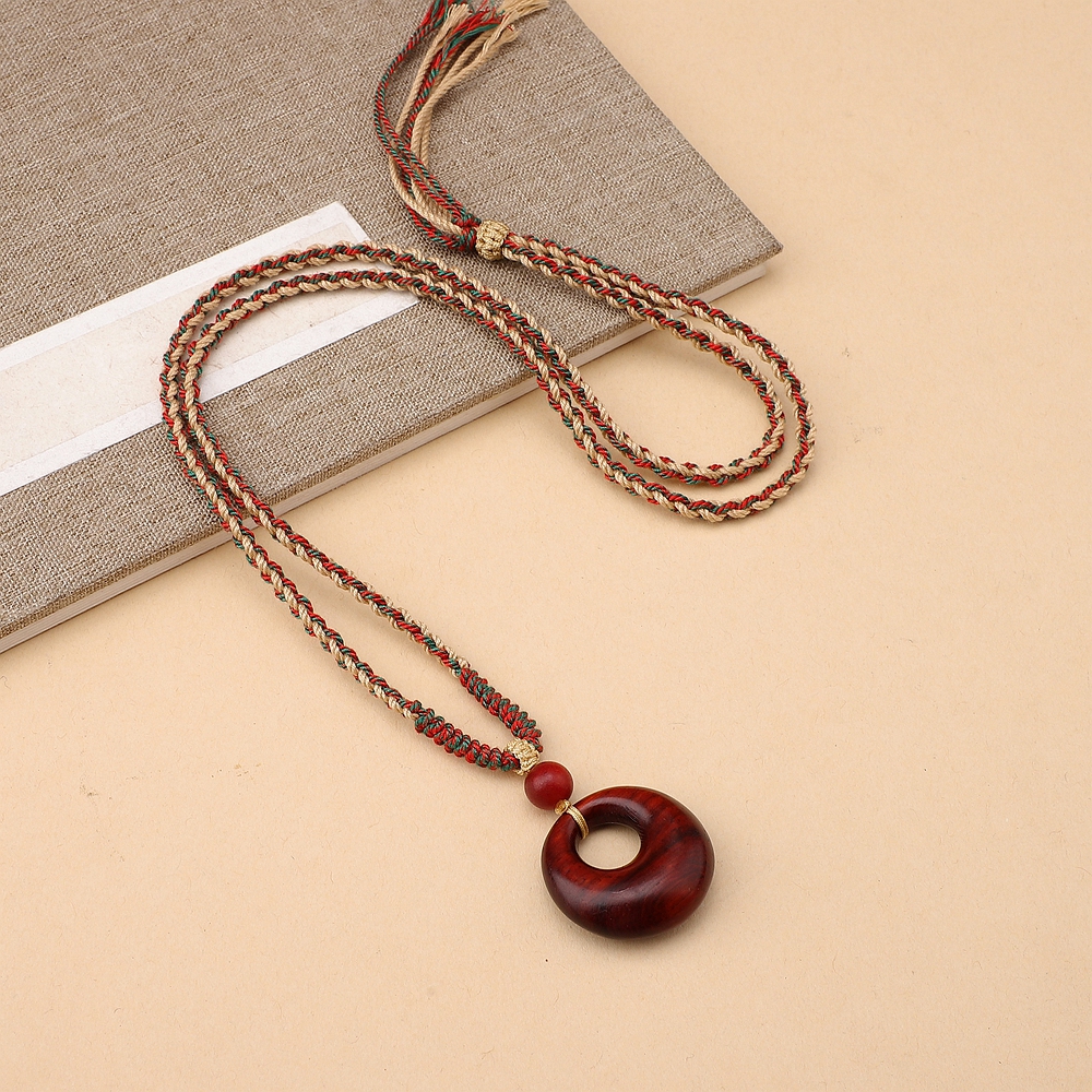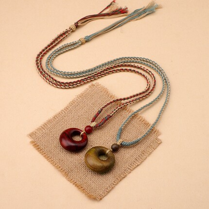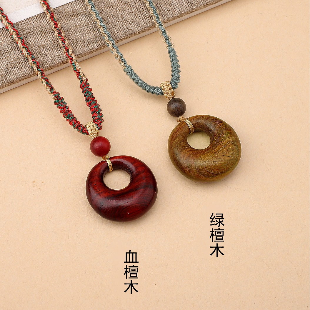 优雅家【同心扣】绿檀木原木项链长款中式吊坠挂件毛衣链棉麻配饰