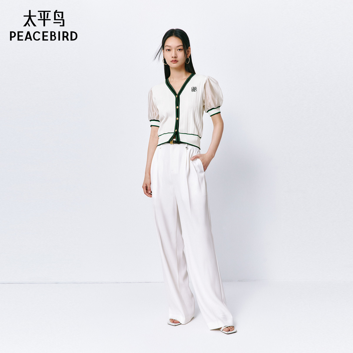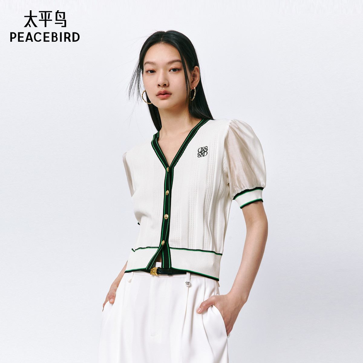 太平鸟短袖小香风针织开衫女夏装新款撞色拼接线针织上衣女