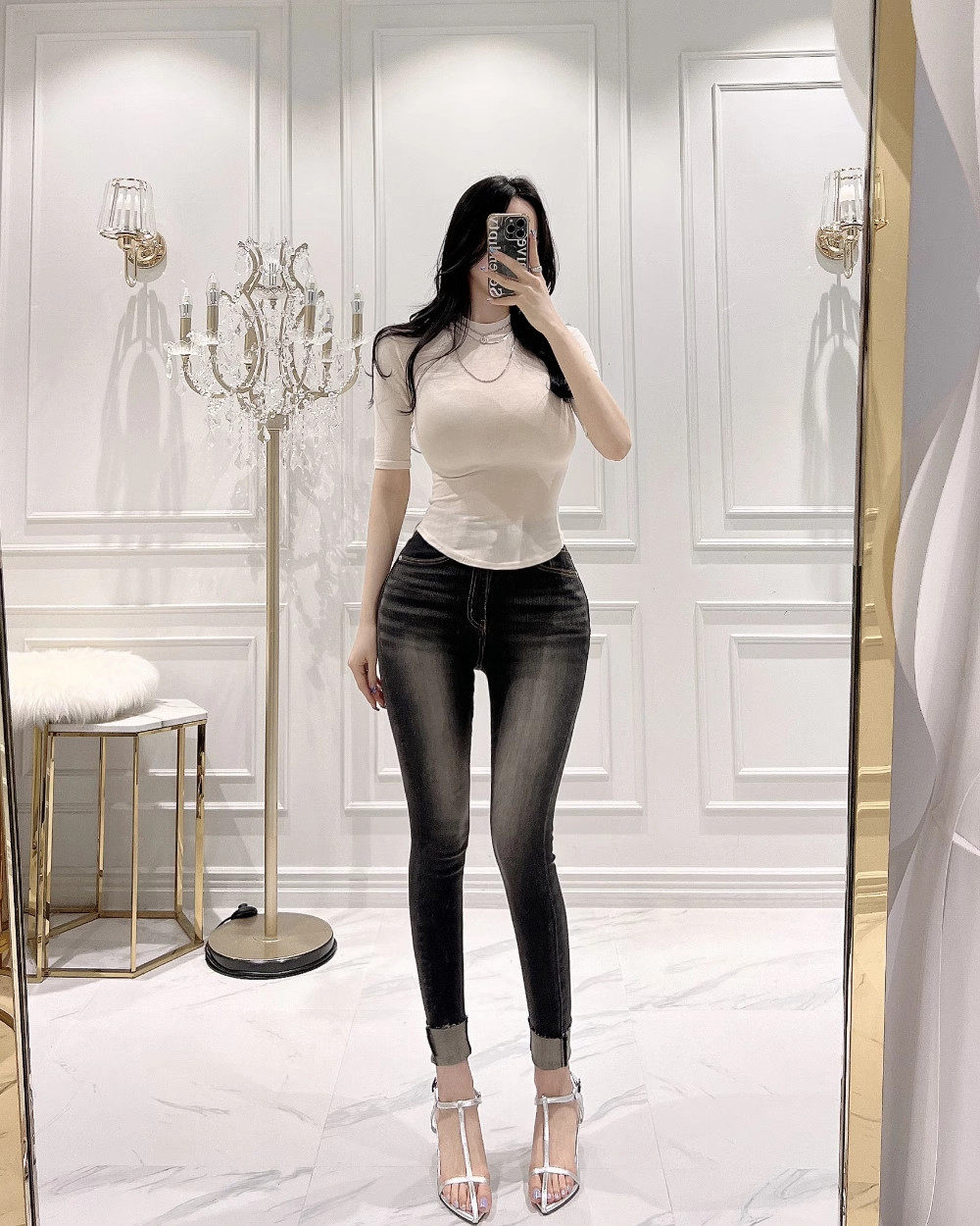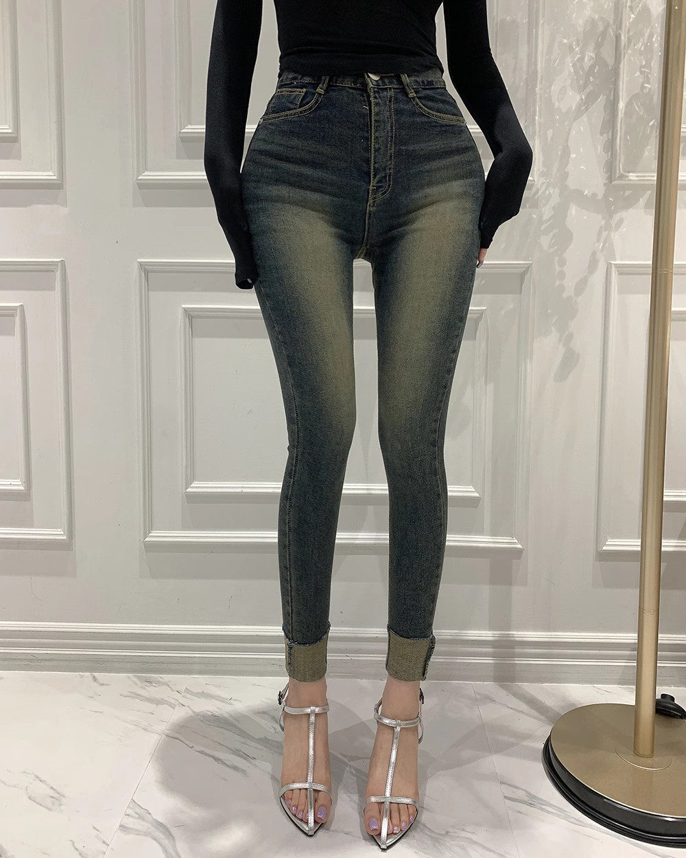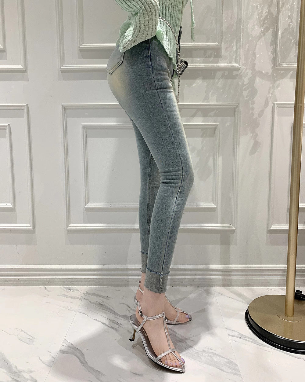 基础三色丰胯小脚牛仔裤~韩国水洗高腰磨白修饰腿型铅笔九分裤女