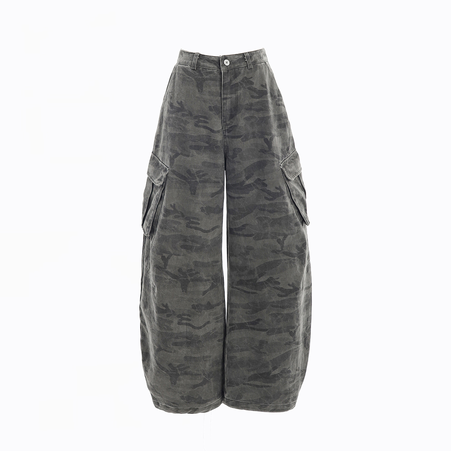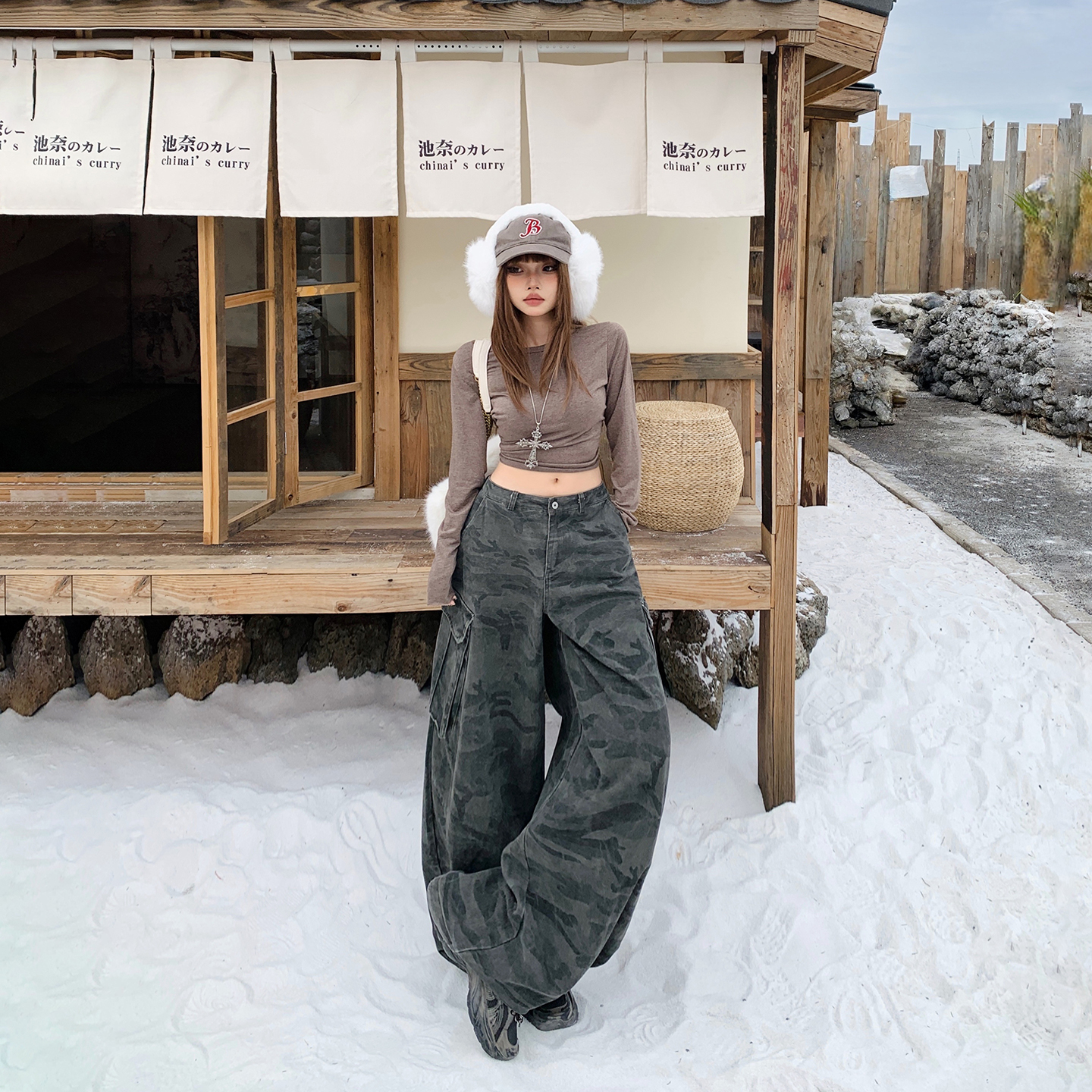 美式复古宽松阔腿裤迷彩弯刀裤百搭垂感工装裤秋冬牛仔裤女