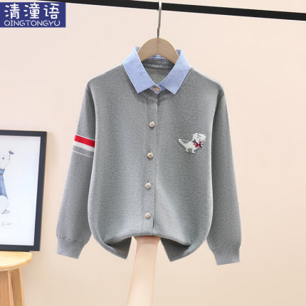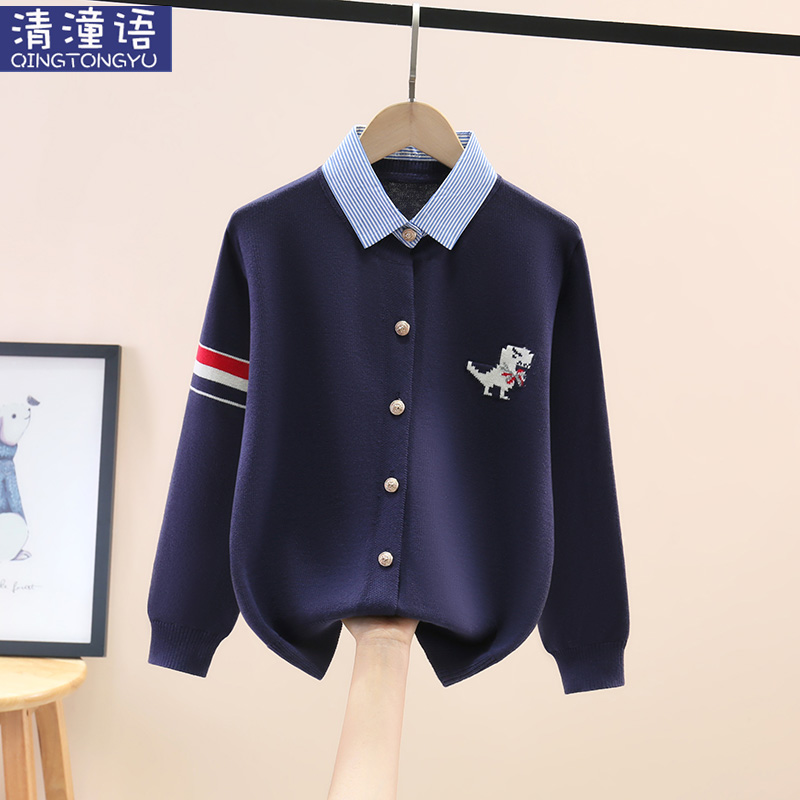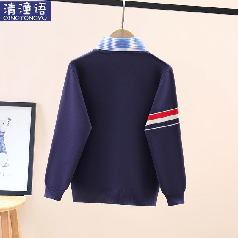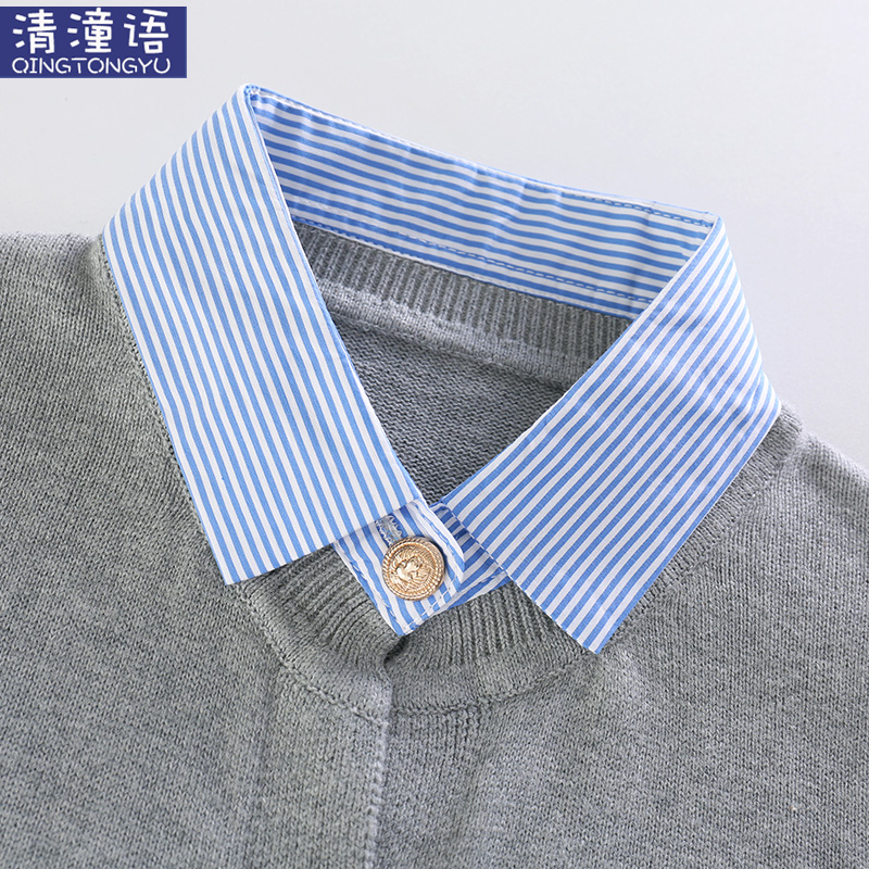男童春秋装毛衣开衫假两件衬衫领2025新款男童针织打底衫帅气上衣