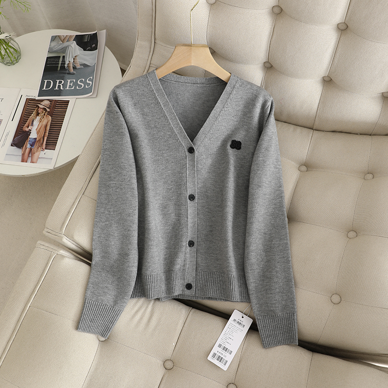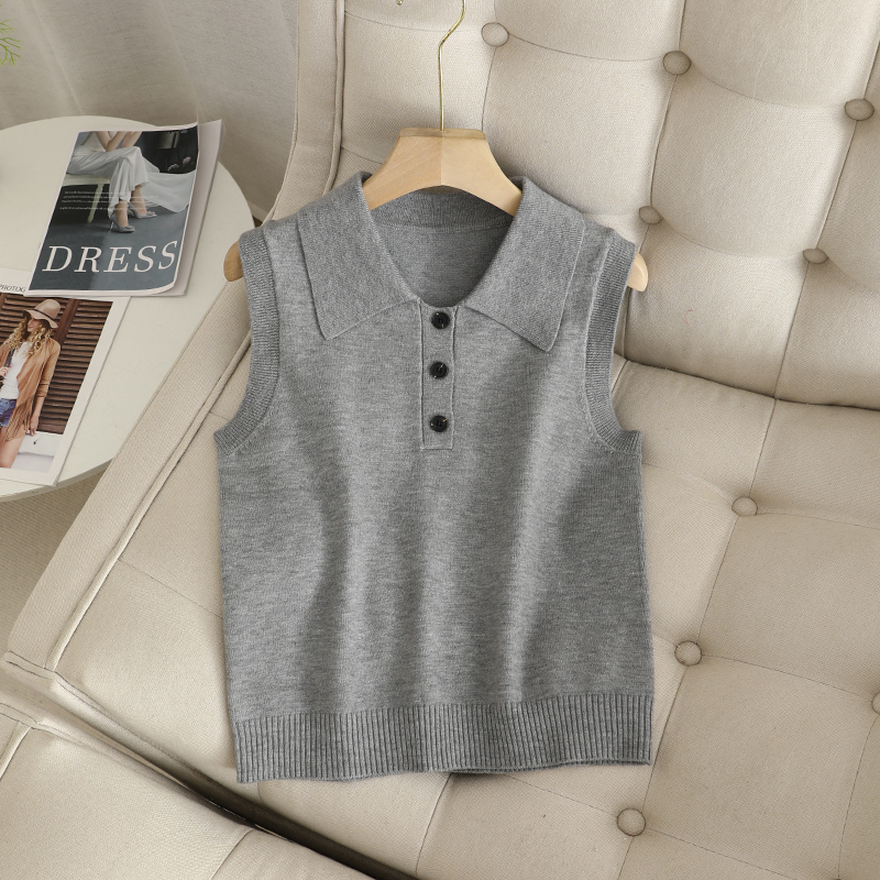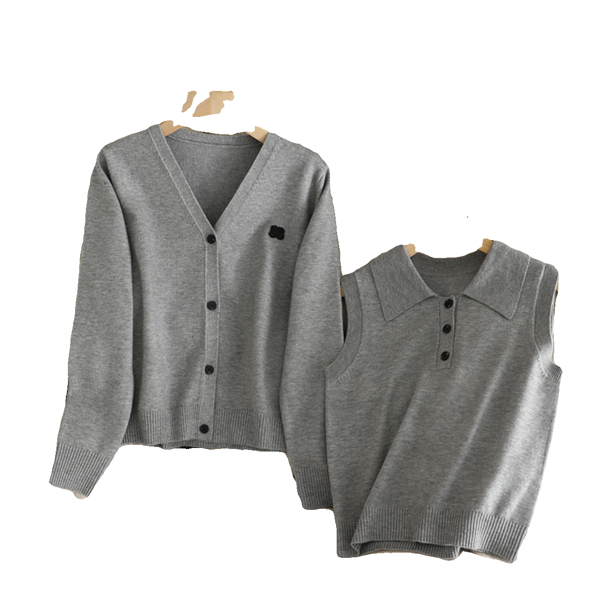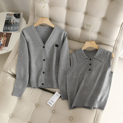 诗系~学院风休闲套装女灰色百搭单排扣V领针织开衫套头马甲两件套