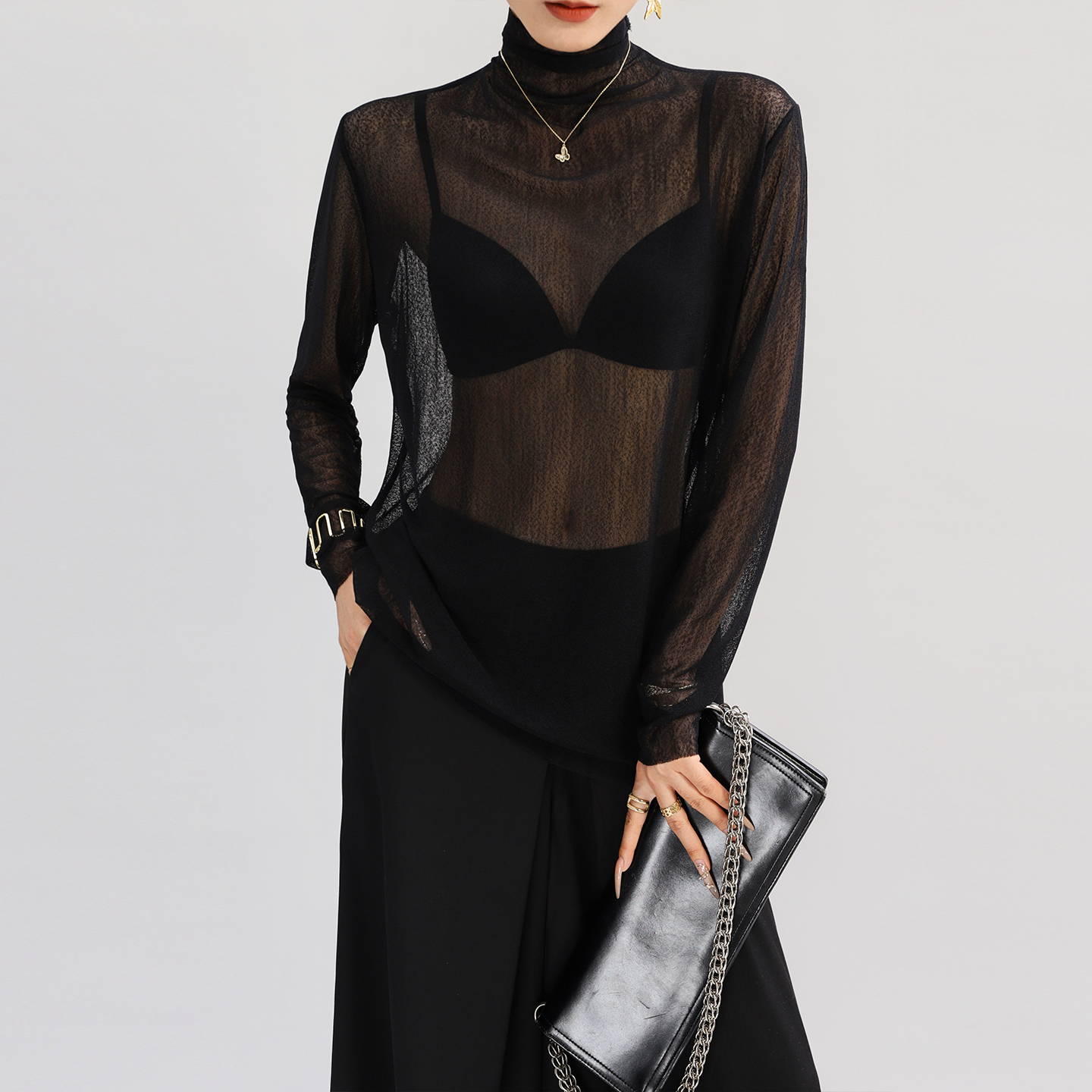 内搭打底衫女黑色高领蕾丝网纱可外穿薄款宽松透明上衣轻奢高级感