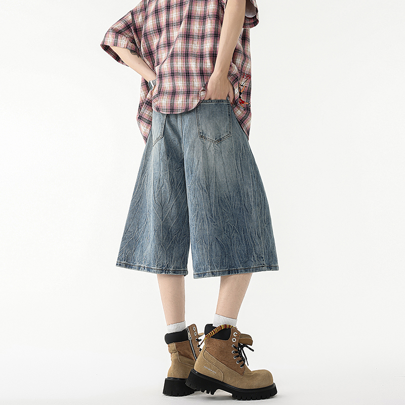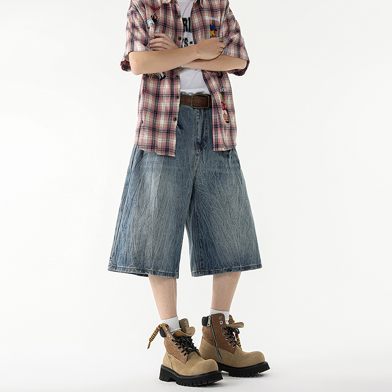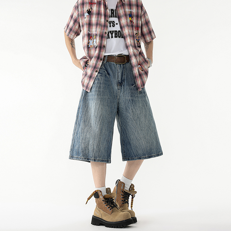复古水洗闪电纹牛仔短裤男女款夏季阔腿宽松七分显瘦直筒休闲中裤