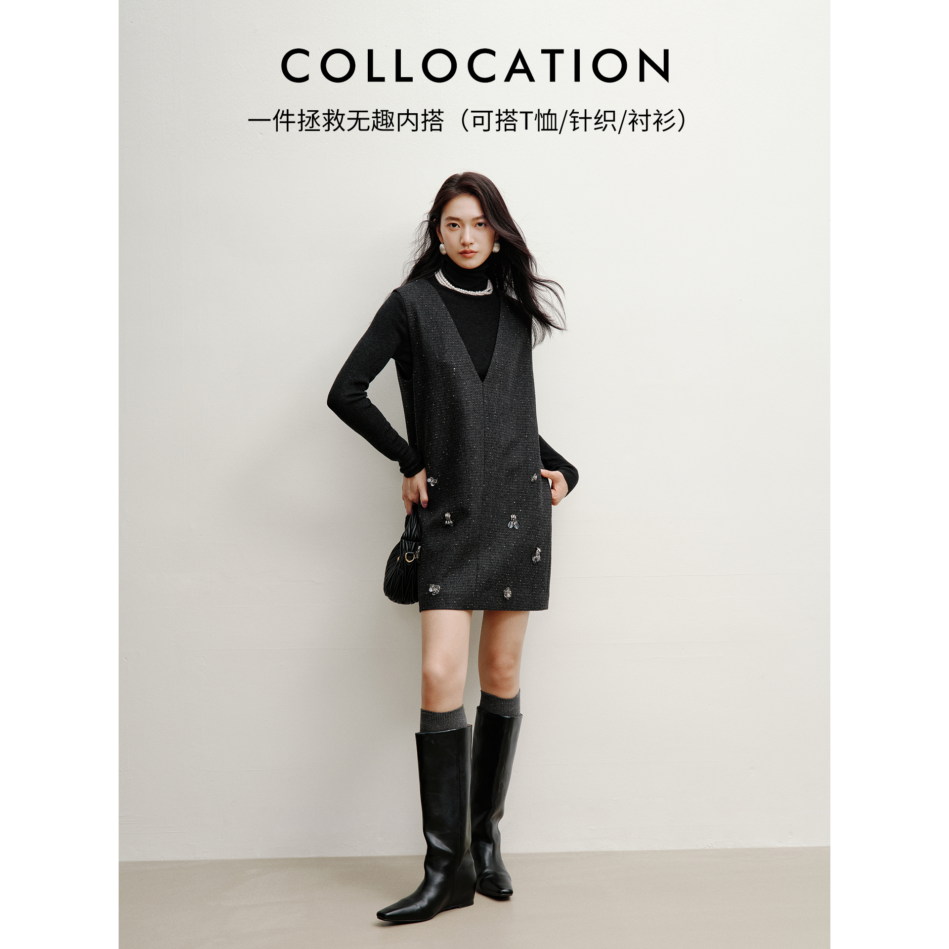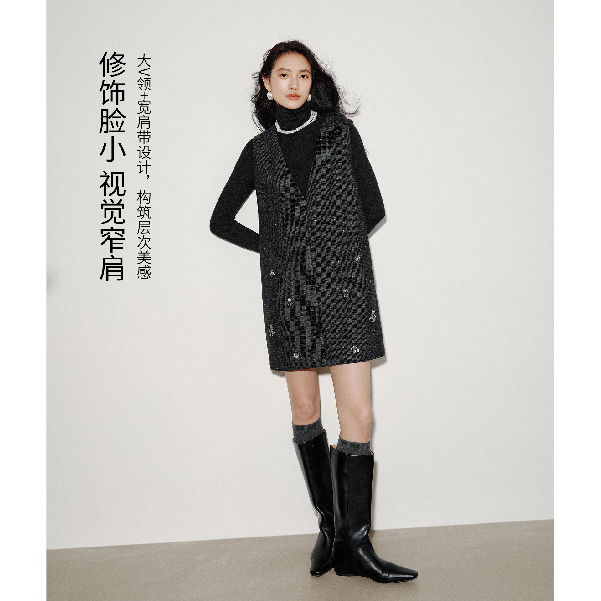 衣香丽影灰色亮片毛呢背心连衣裙女2025冬装新款无袖直筒羊毛裙子