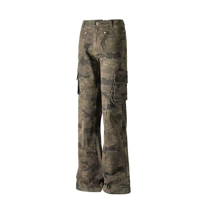 美式复古迷彩微喇工装裤男款秋季高街裤子cleanfit修身弯刀牛仔裤