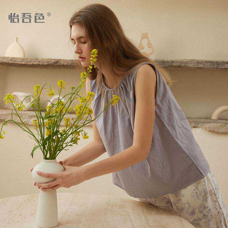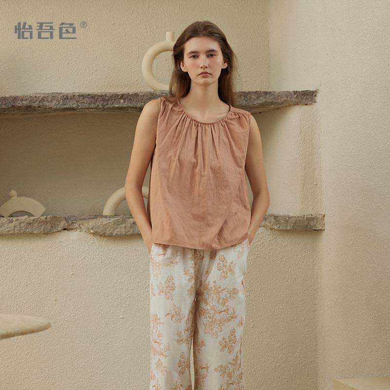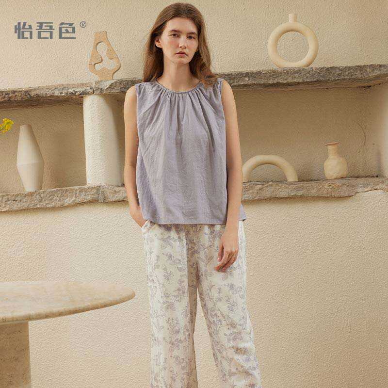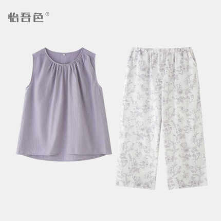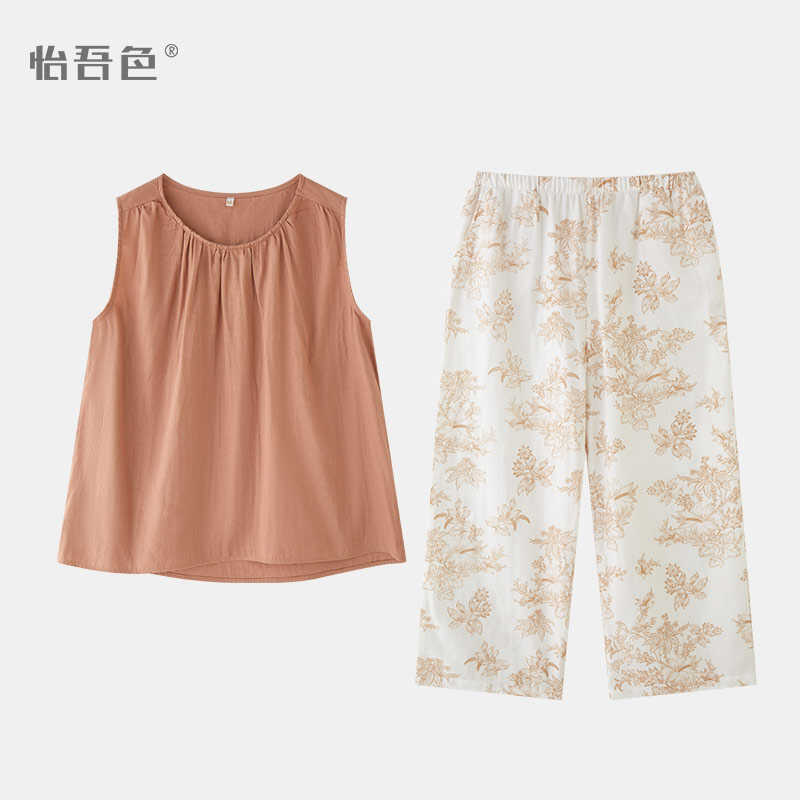 怡吾色 女睡衣复古小圆领新疆棉双层纱居家可外穿无袖家居服套装