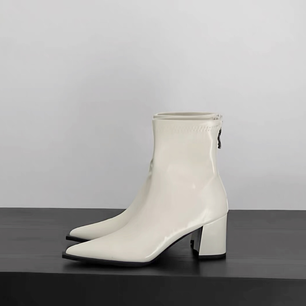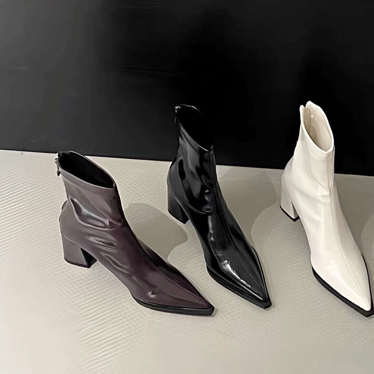2025新品女鞋尖头弹力高跟短靴女气质黑色时装裸靴百搭粗跟瘦瘦靴