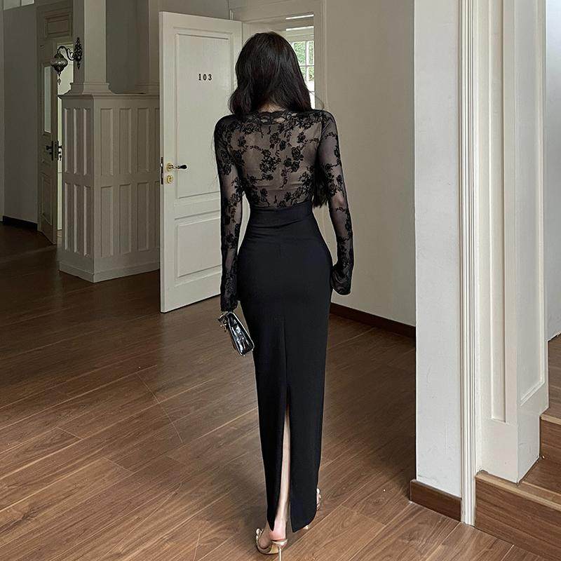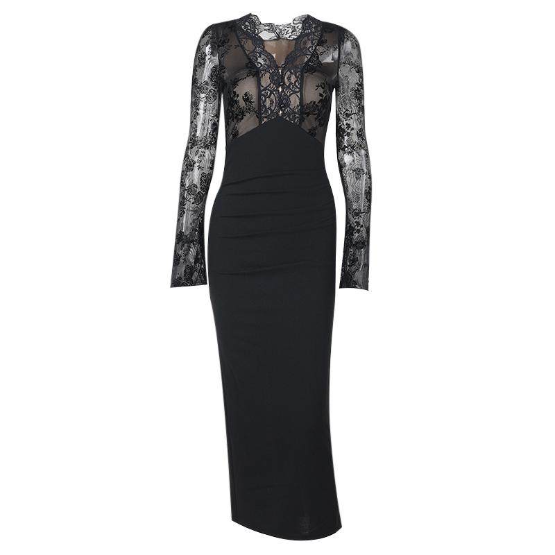 instunning御姐风性感蕾丝拼接长袖连衣裙女秋冬新款收腰气质长裙