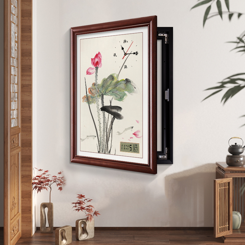 电表箱装饰画竖版带钟表新中式配电箱挂画电闸箱总开关盒饭厅壁画