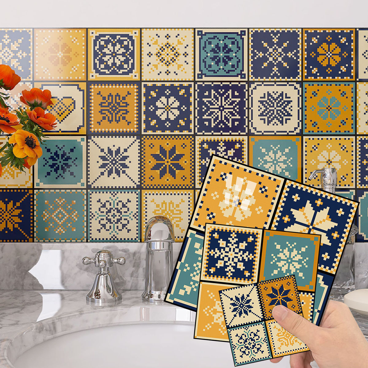 一套10片高亮水晶复古花砖纹卫生间防水自粘贴纸厨房防油墙壁纸