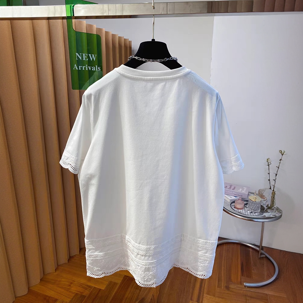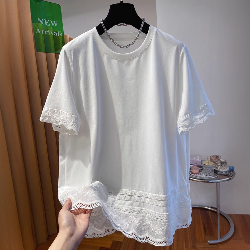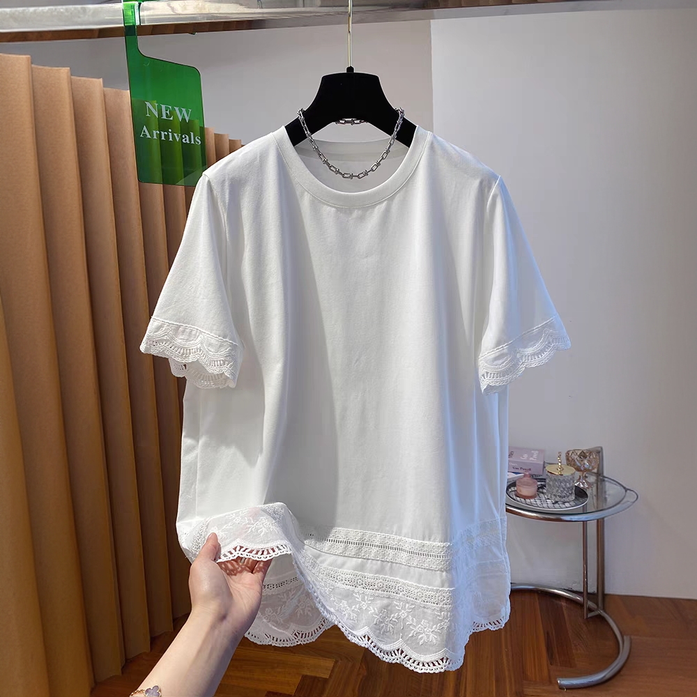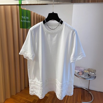 白色蕾丝拼接纯棉t恤女短袖2025夏季新款大码宽松圆领打底衫上衣