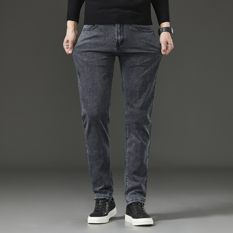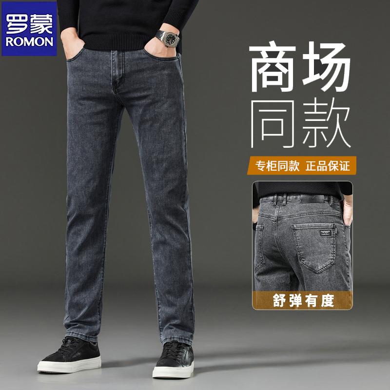 罗蒙加绒牛仔裤男弹力修身直筒秋冬季加厚休闲商务宽松烟灰色百搭