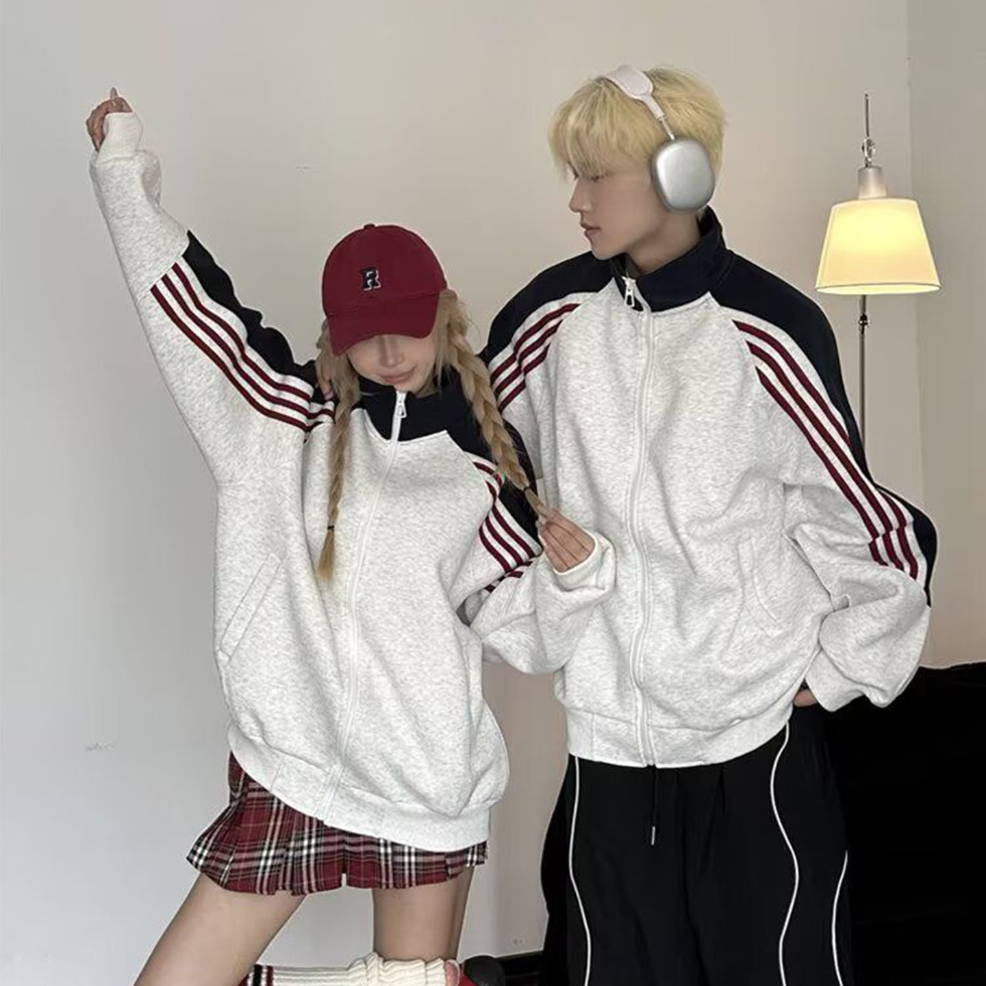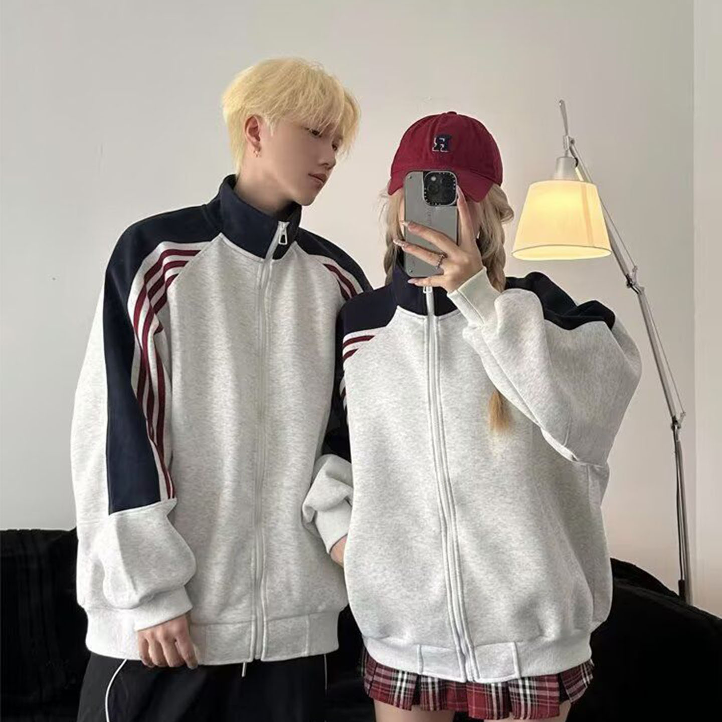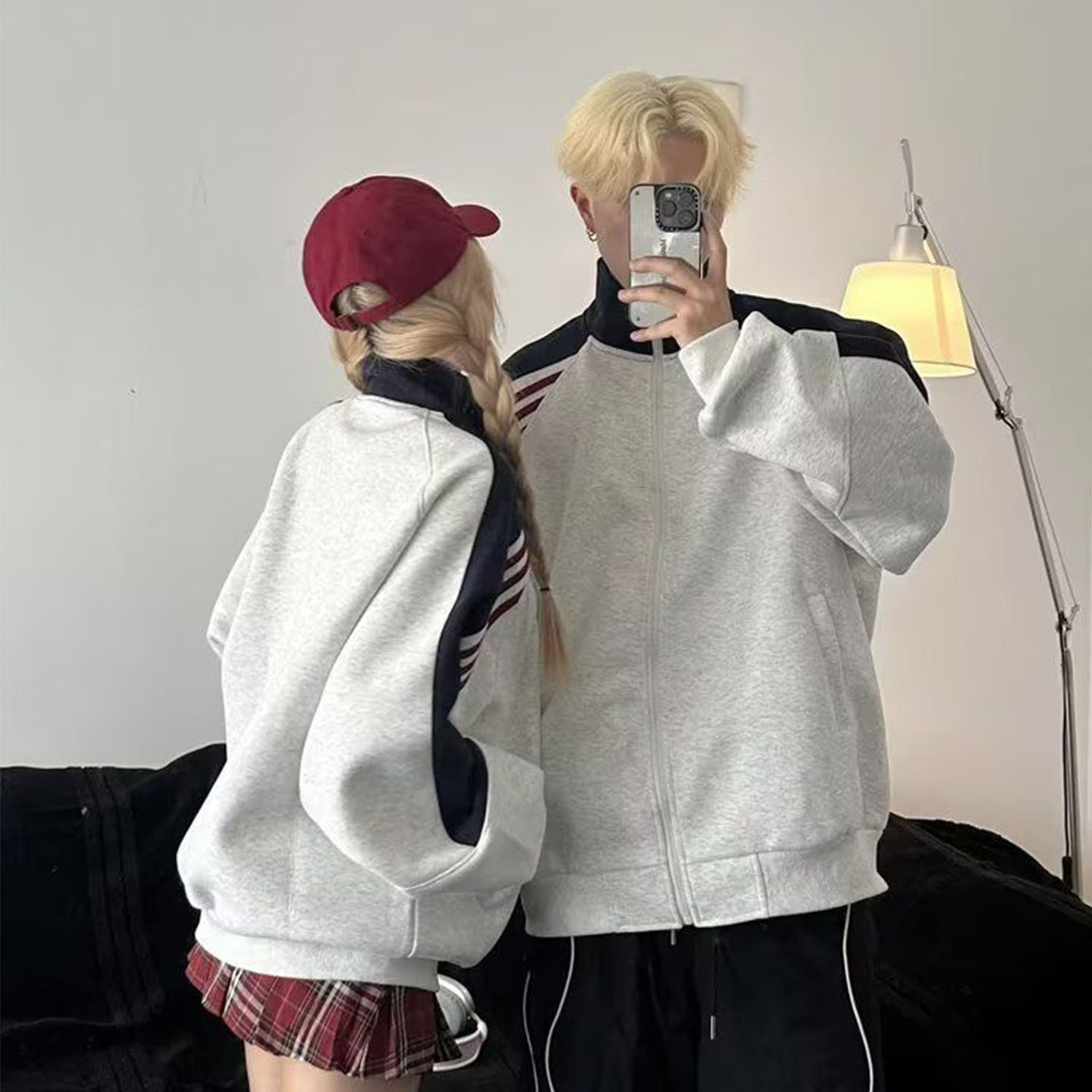 美式慵懒风chic开衫卫衣女款春秋薄款撞色拼接运动休闲情侣装外套