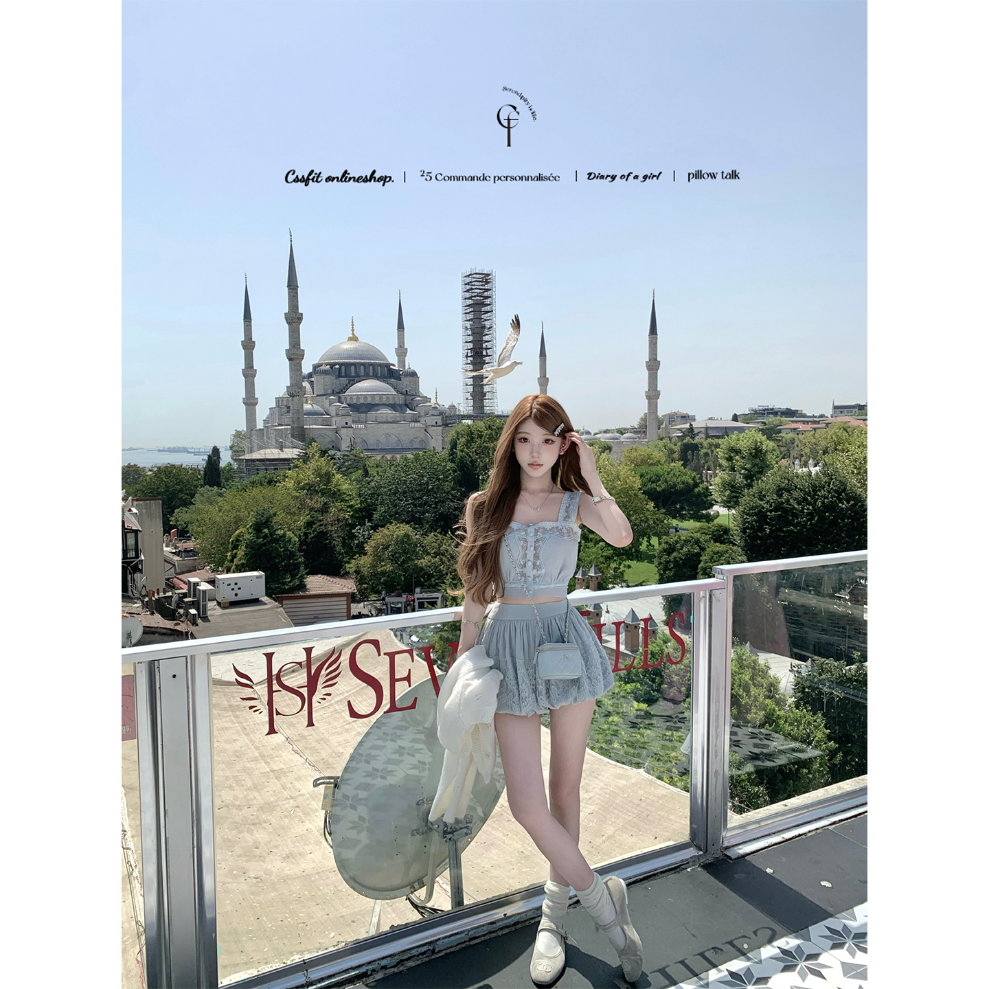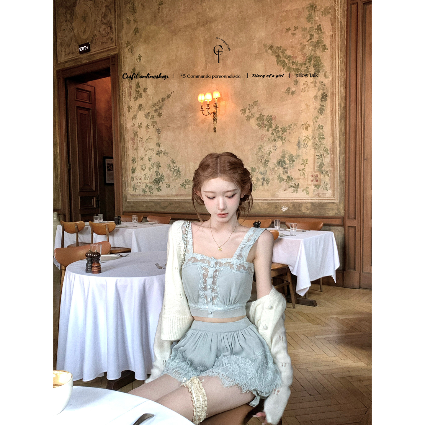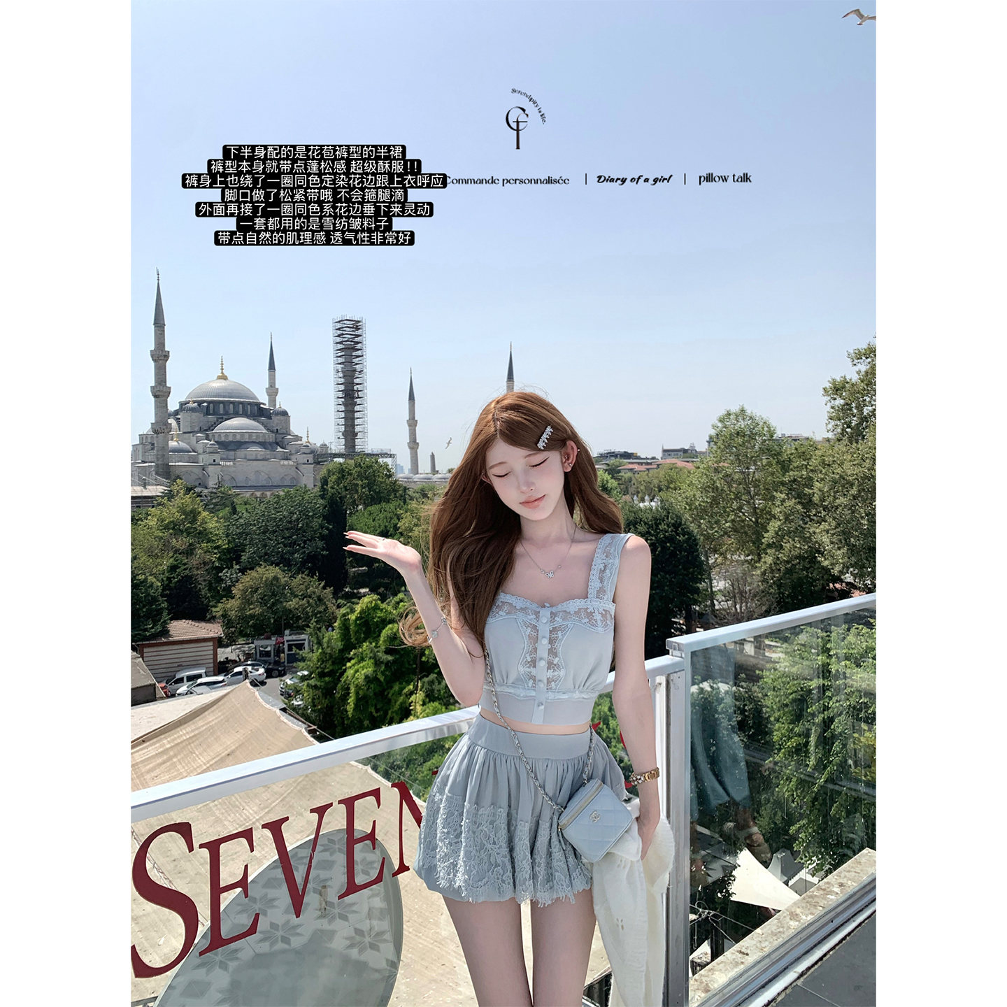 迟伞伞25/fw 蓝鸢尾Juliet 蓝灰色蕾丝拼接无袖上衣裙裤时髦套装