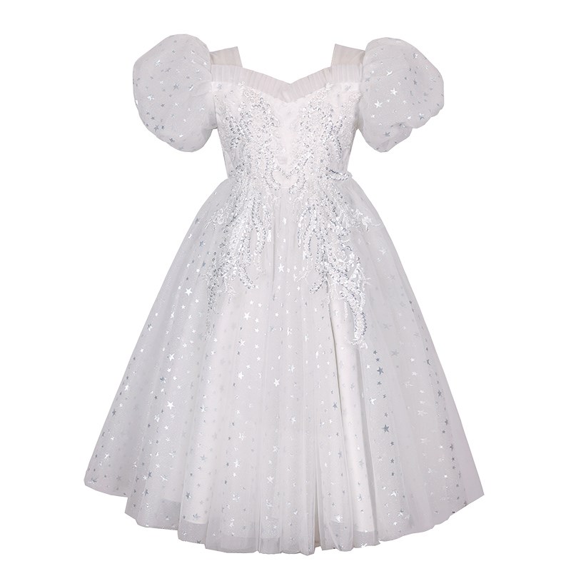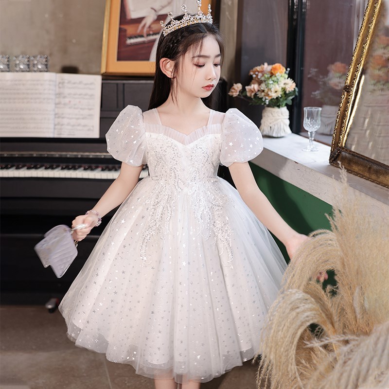 儿童礼服公主裙小女孩夏季白色花童婚纱女童钢琴演奏主持人演出服