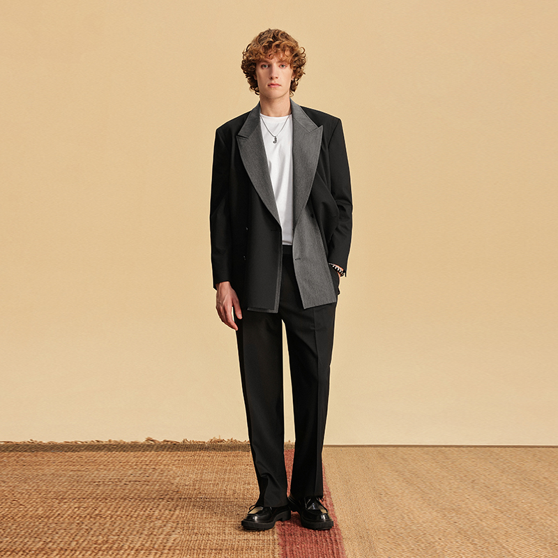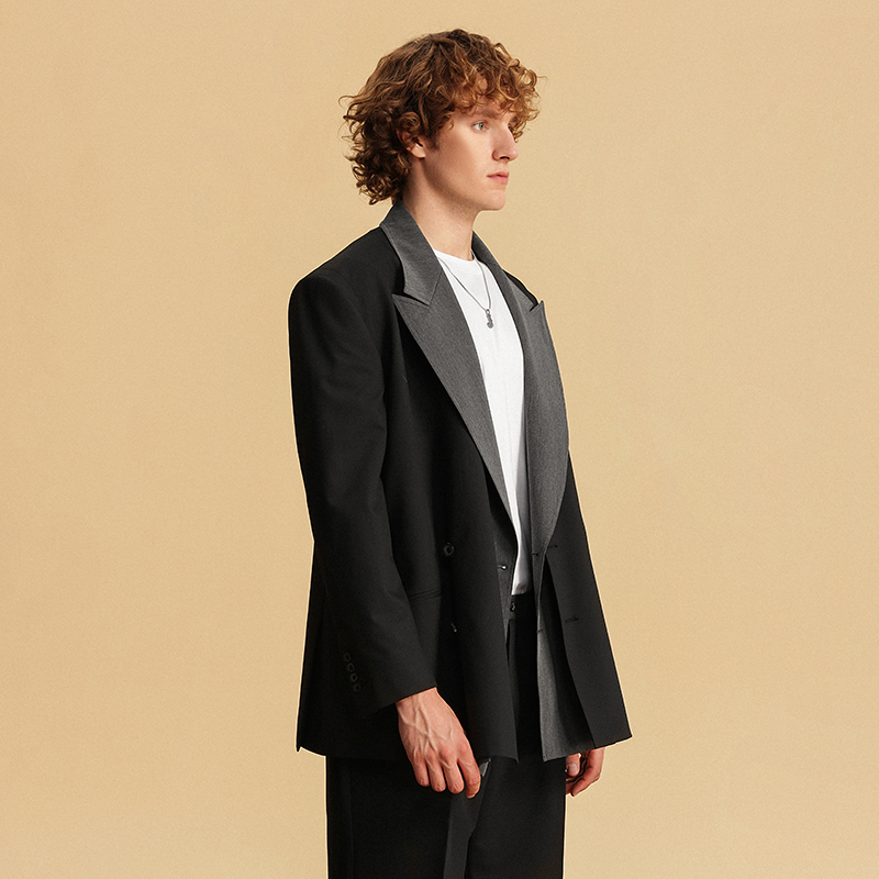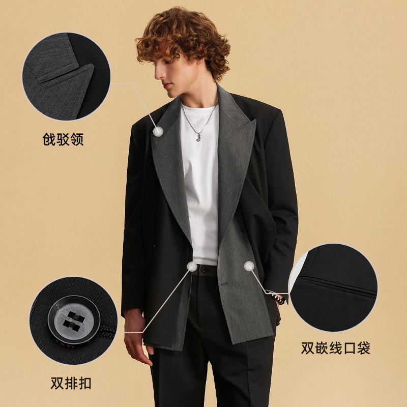JDV男装秋季新品商场同款黑色拼接西装双排扣百搭西服外套SMJ4030