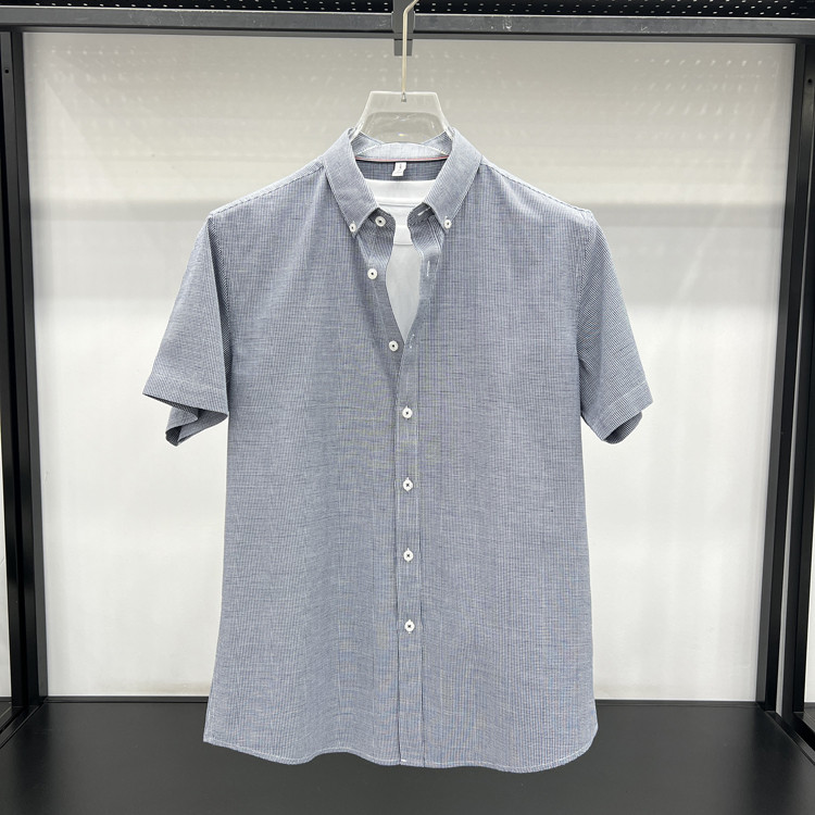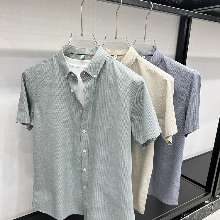2025年春季新款中青年男士短袖衬衫高端千鸟格子商务休闲棉麻衬衣