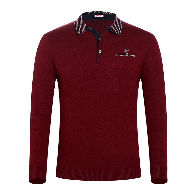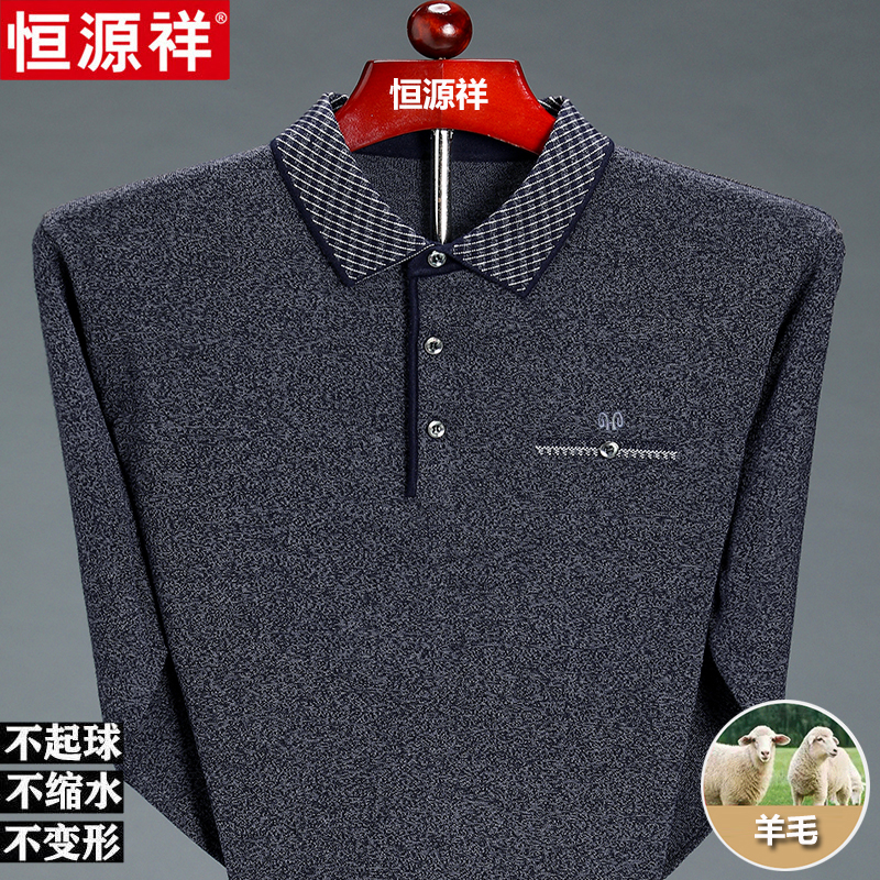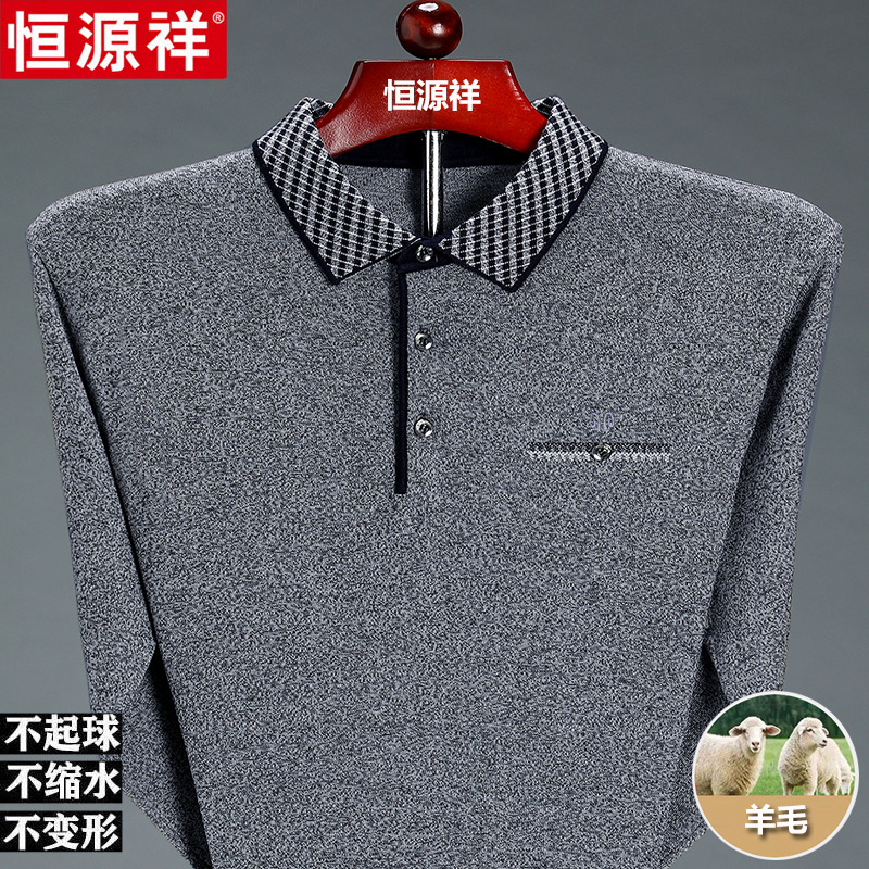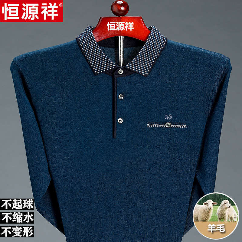 恒源祥长袖t恤男中老年翻领薄爸爸装2024春秋季针织纯羊毛打底衫