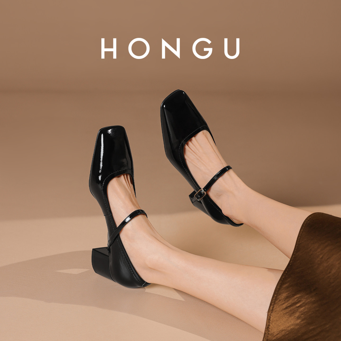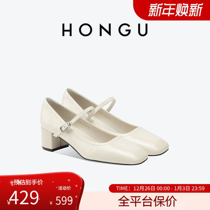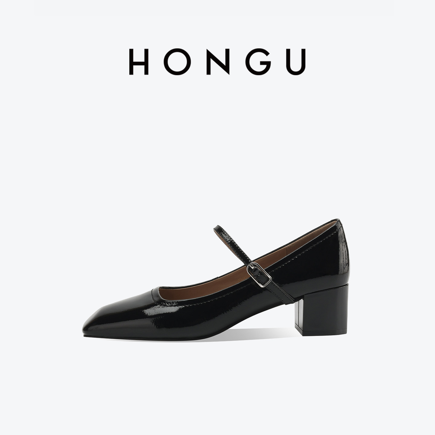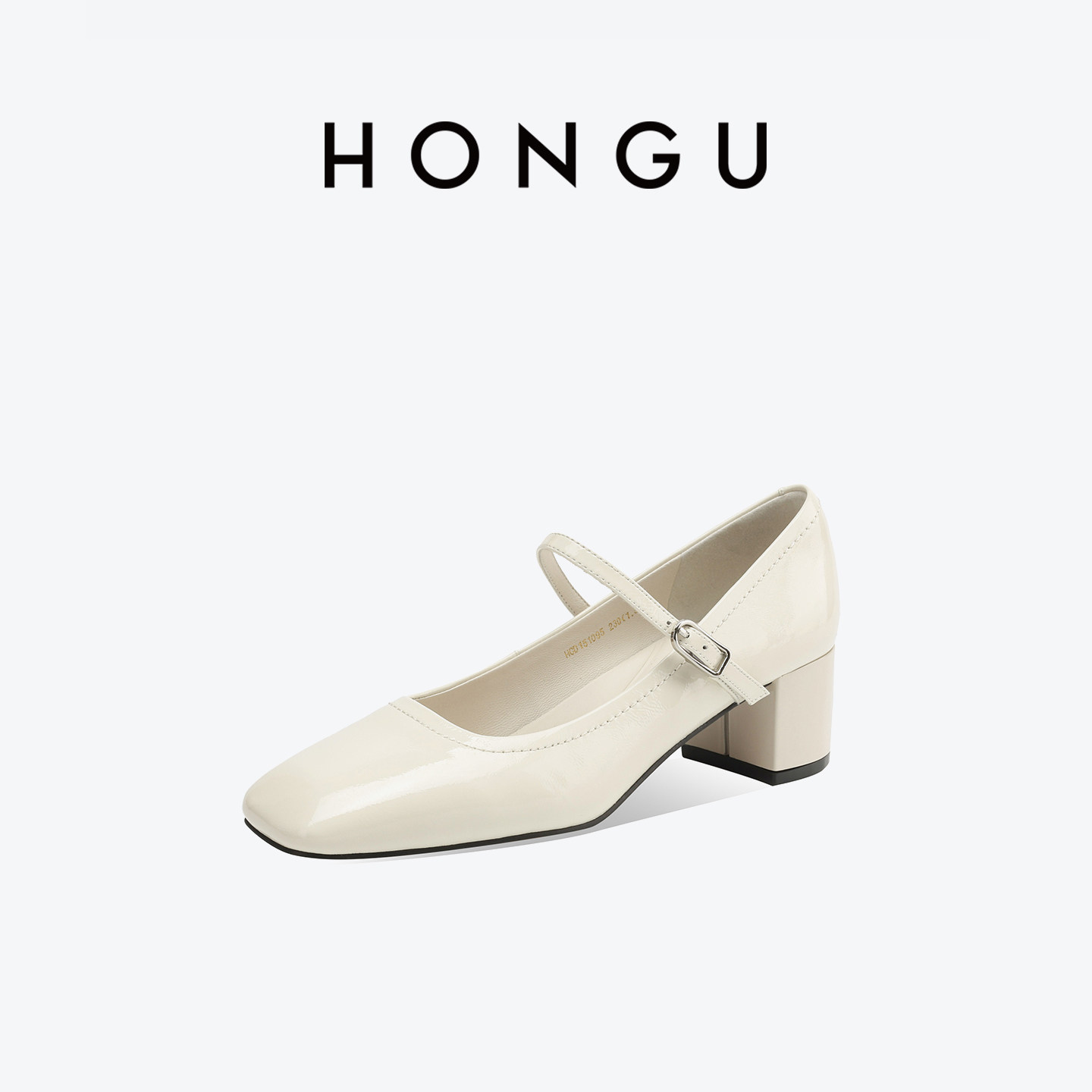 【初雪界碑】红谷真皮浅口单鞋女2026春季新款粗跟小方头玛丽珍鞋