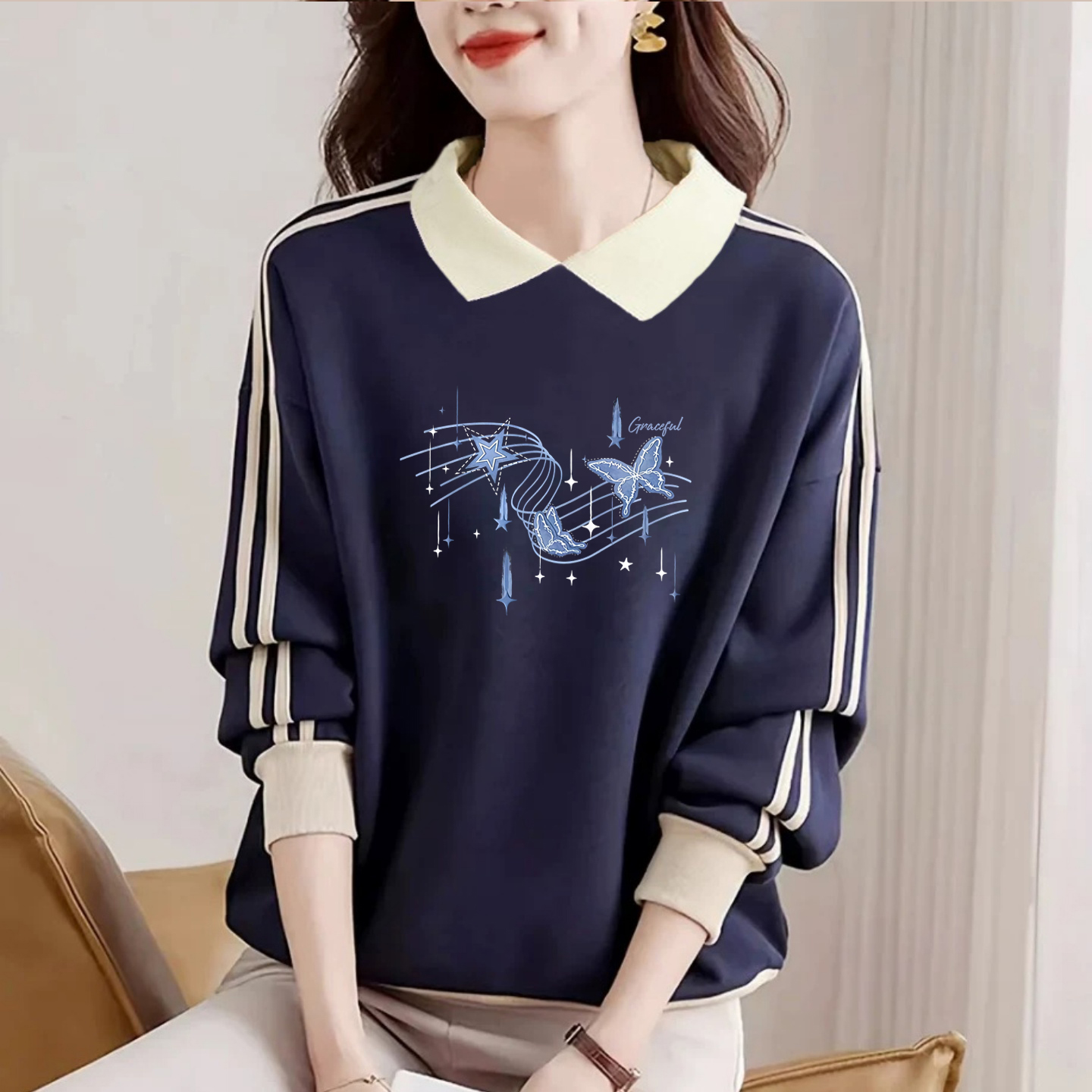 韩系高品质女装秋季休闲polo领上衣女撞色长袖卫衣气质拼接打底衫