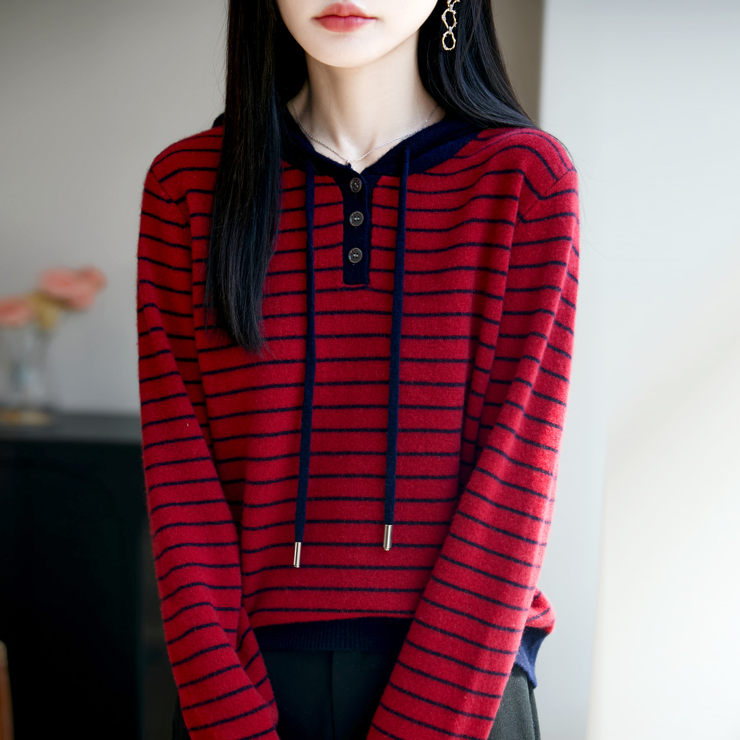100羊毛三粒扣拼色条纹帽衫女式宽松连帽撞色卫衣打底衫毛衣新品