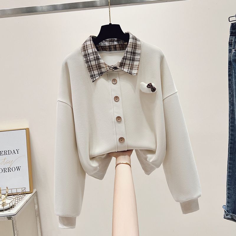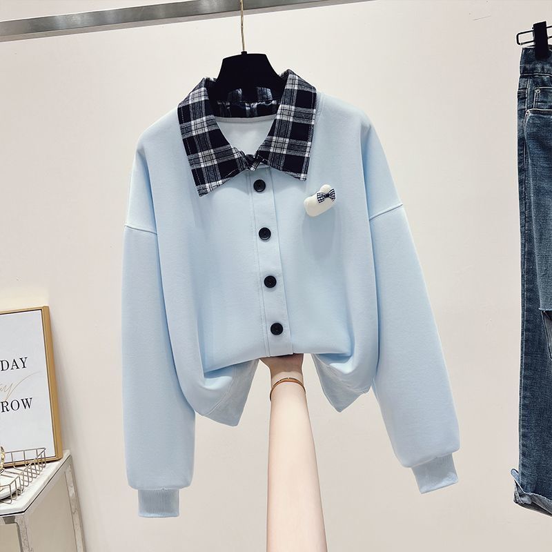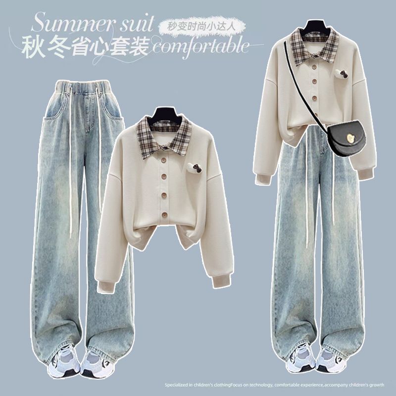 时尚套装学院风格纹拼接polo领卫衣搭配复古松紧腰抽绳牛仔裤女