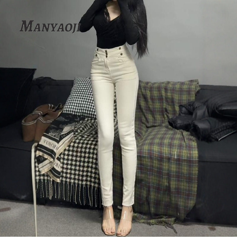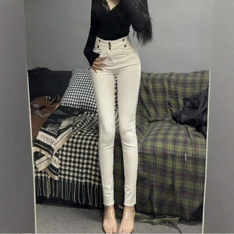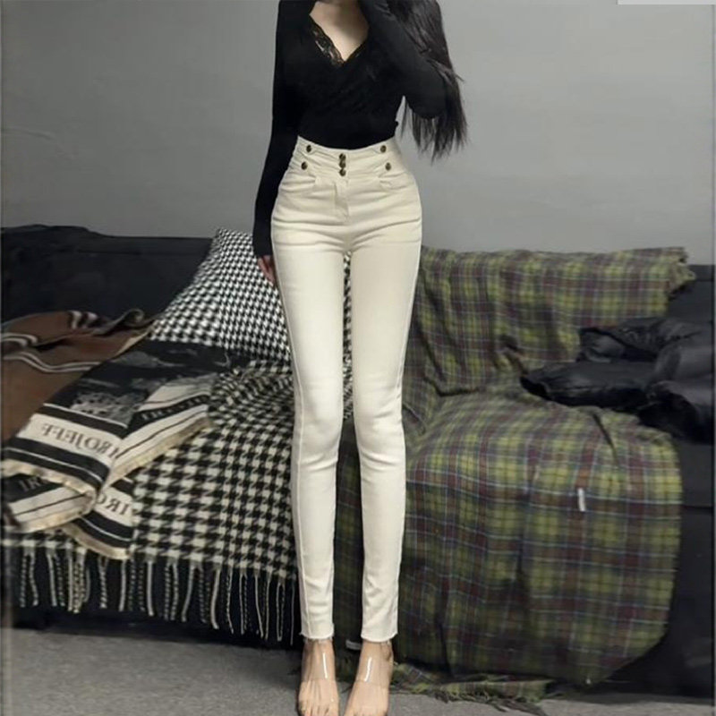 米白色高腰小脚牛仔裤女2025年冬季加绒紧身弹力显瘦显高铅笔长裤