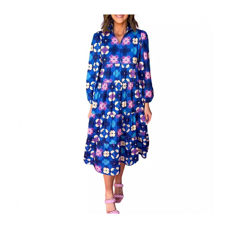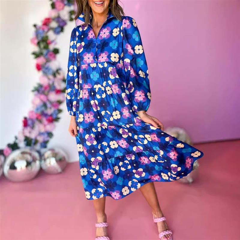 秋季新款宽松遮肚中长裙欧美复古花卉印花V领长袖时尚连衣裙