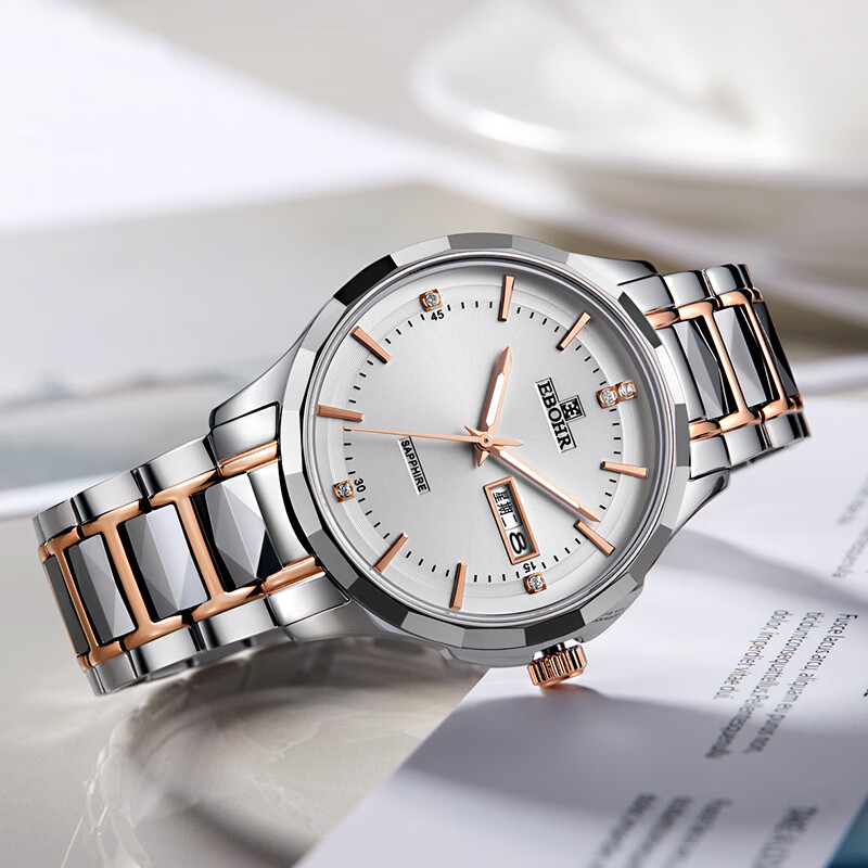 依波表(EBOHR)钨钢表时尚间枚金色石英表男表女表双历镶钻3009