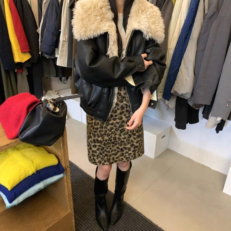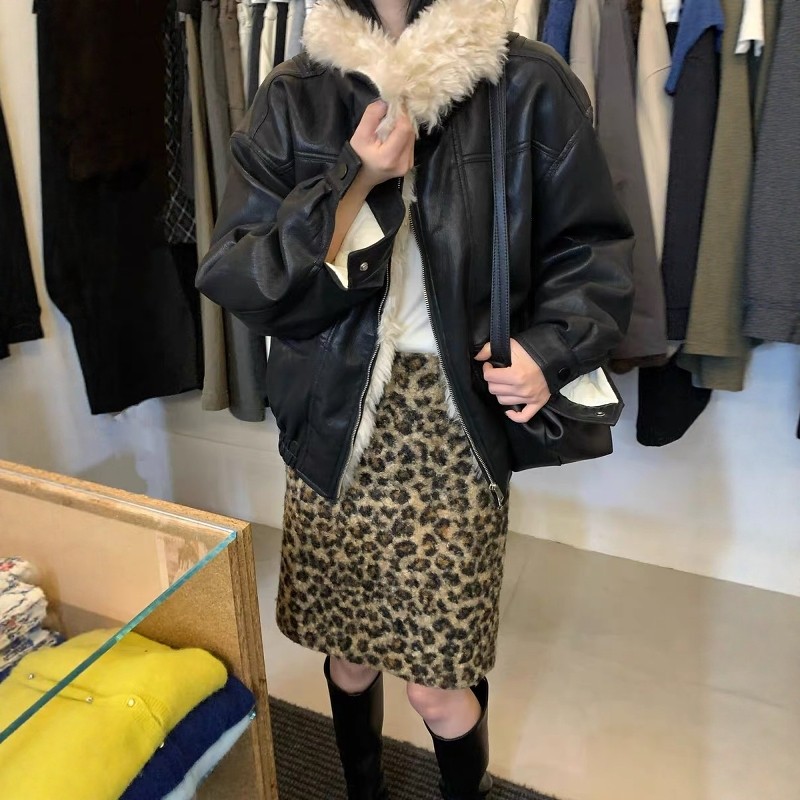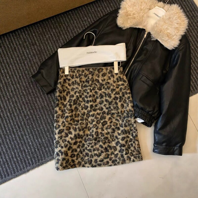 欧货羊羔毛豹纹半身裙女加厚中裙2025冬季新款时尚显瘦包臀裙靴裙