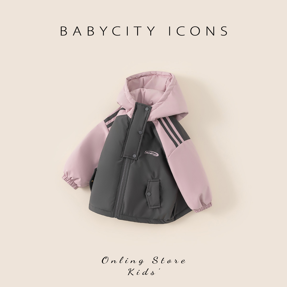 贝贝城撞色半门襟连帽棉服外套