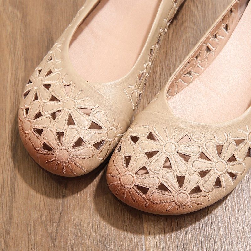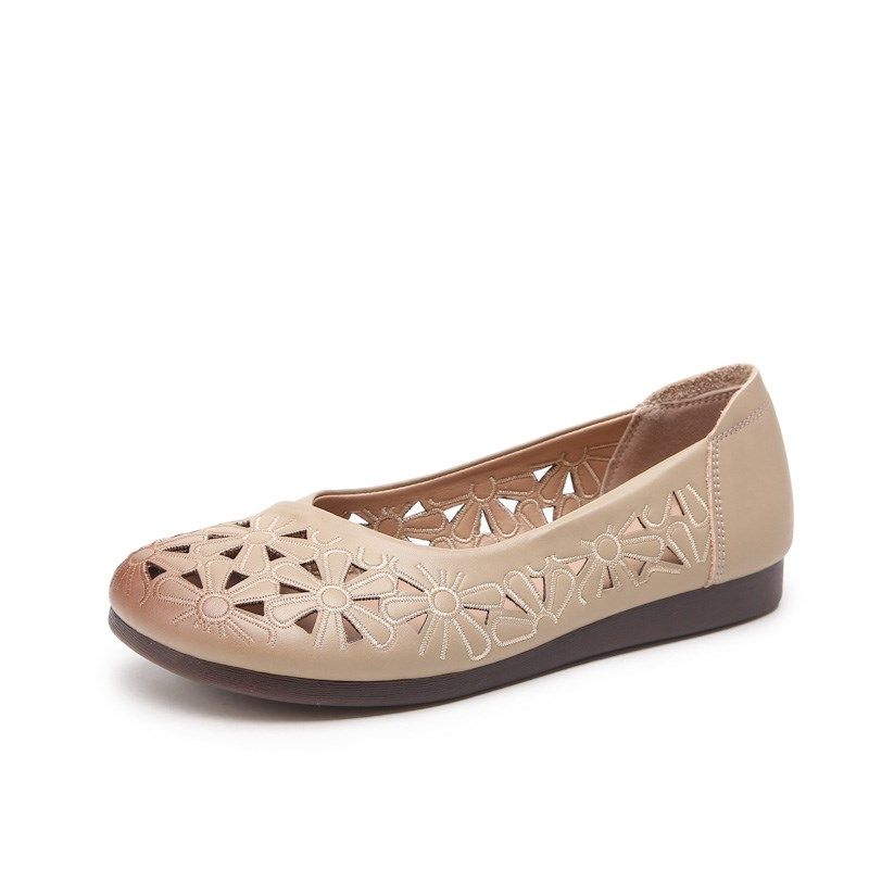 妈妈鞋真皮平底平跟皮鞋中老年人春夏季优雅凉鞋镂空中年女洞洞鞋