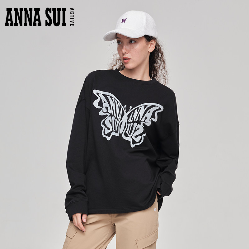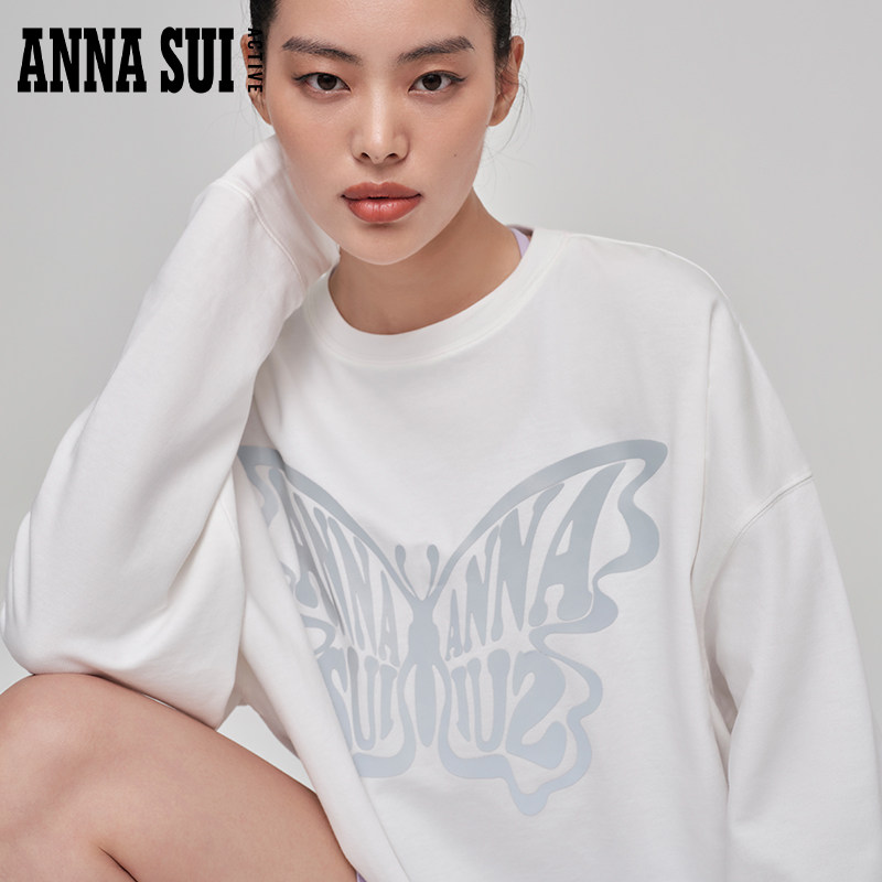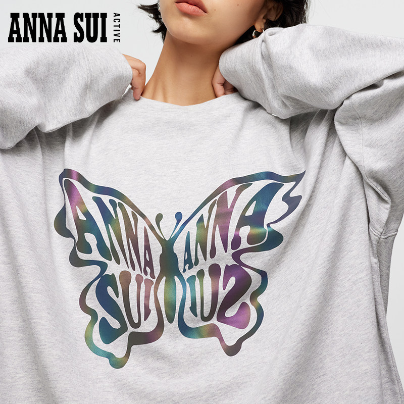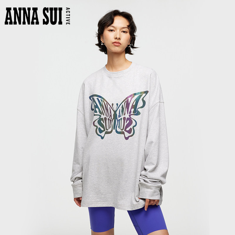 ANNA SUI安娜苏运动 银色反光蝴蝶慵懒感印花T恤宽松落肩袖卫衣女