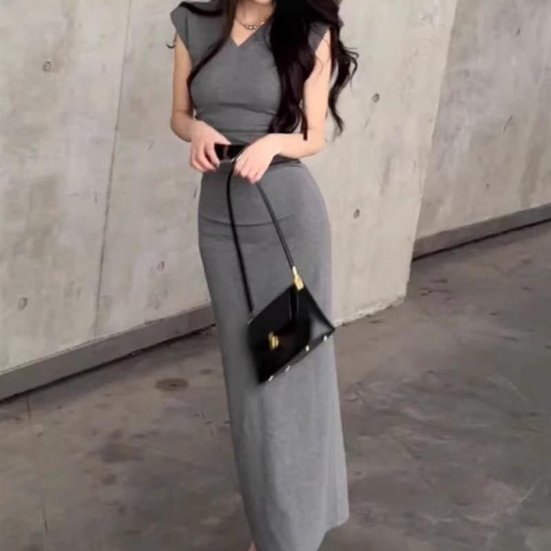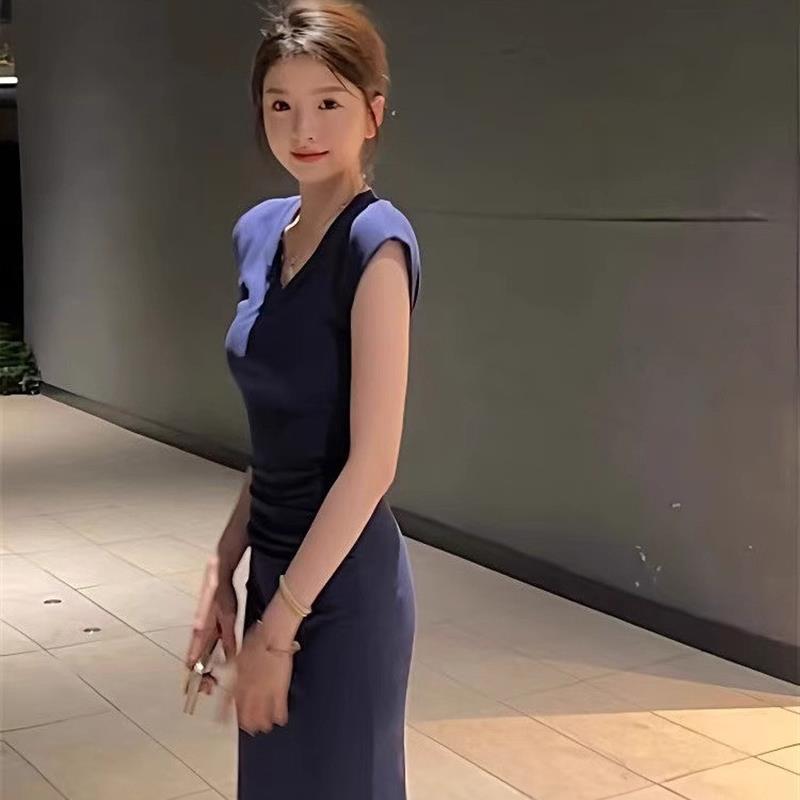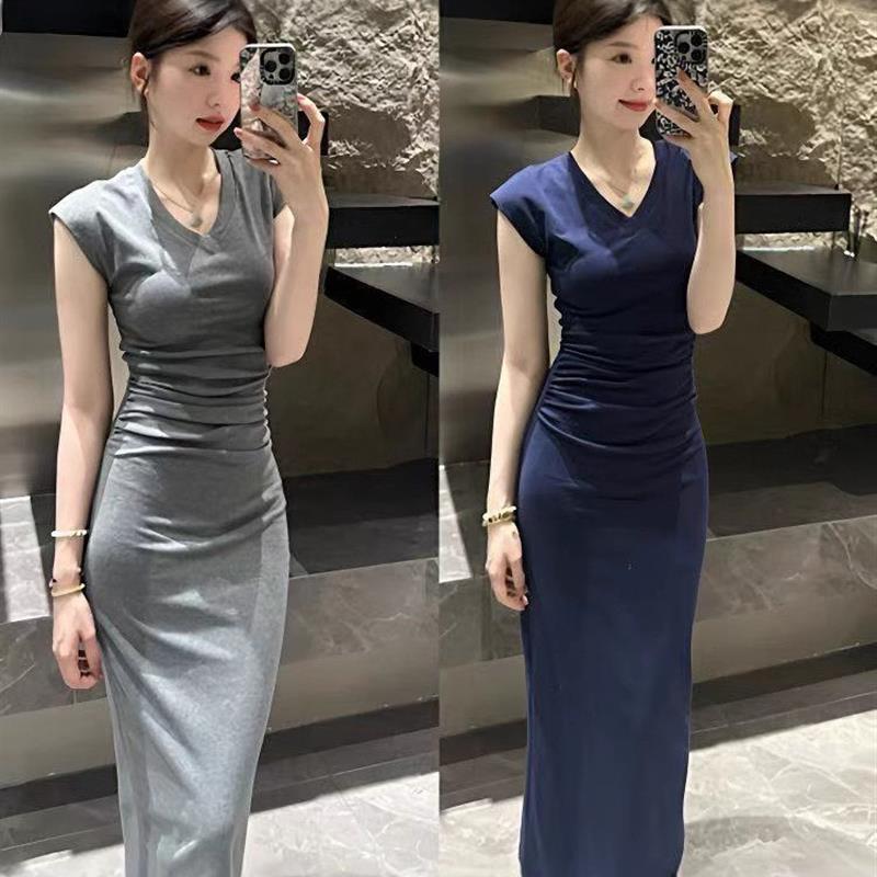 夏季V领收腰连衣裙女设计感褶皱显瘦修身法式小众包臀长裙