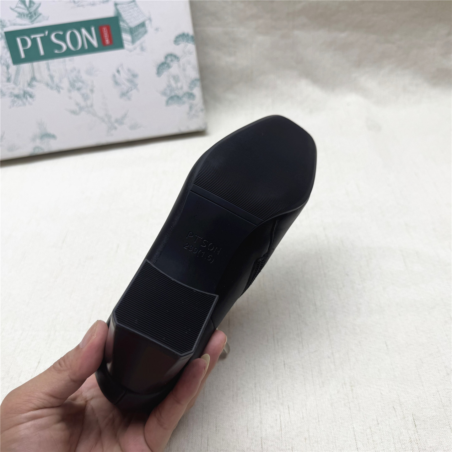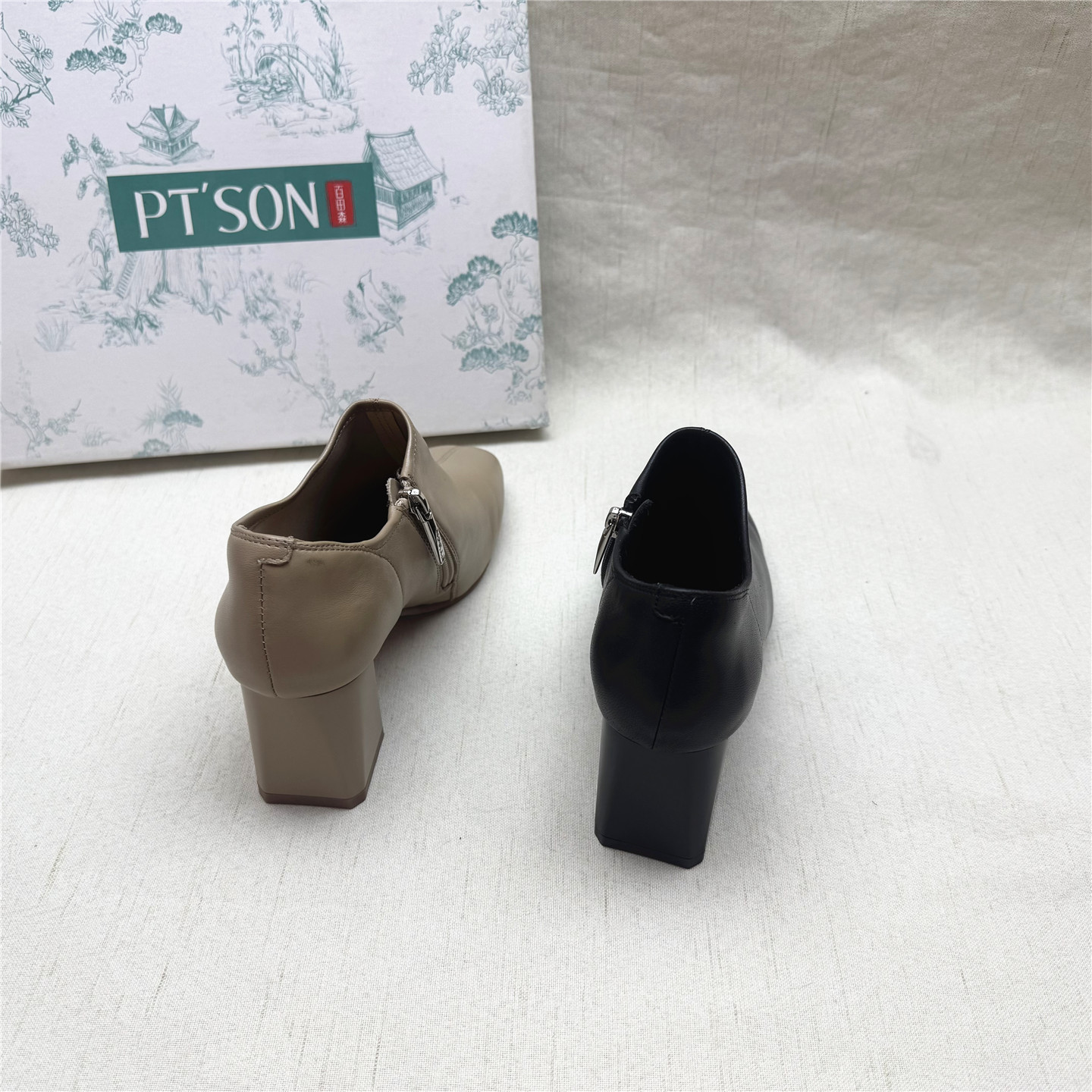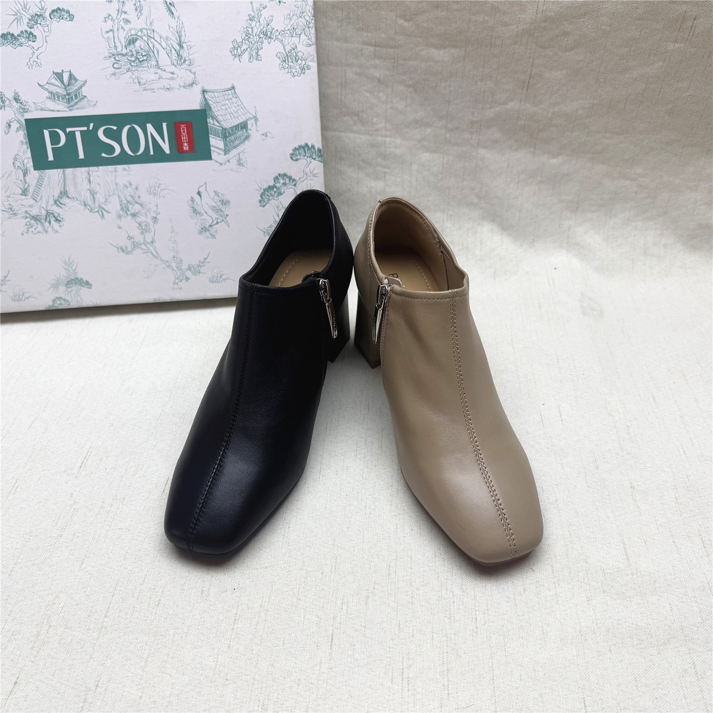 PT'SON/百田森正品撤柜粗跟方头及裸靴女春秋新款真皮侧拉链单鞋