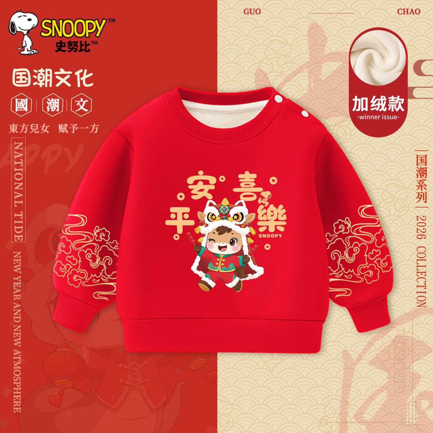 史努比儿童加绒卫衣男童2026新年红色上衣女童冬装宝宝秋冬款衣服