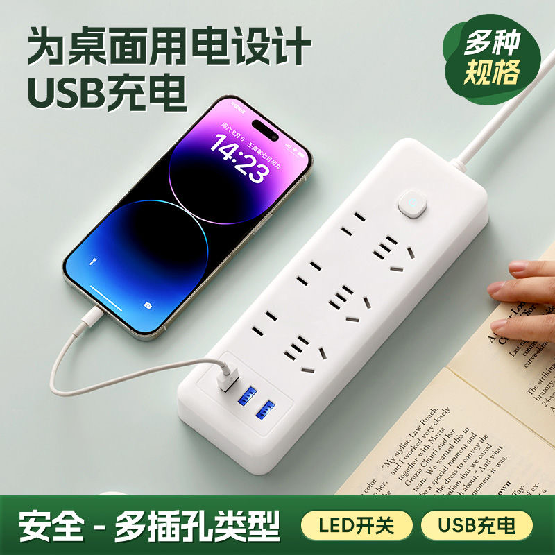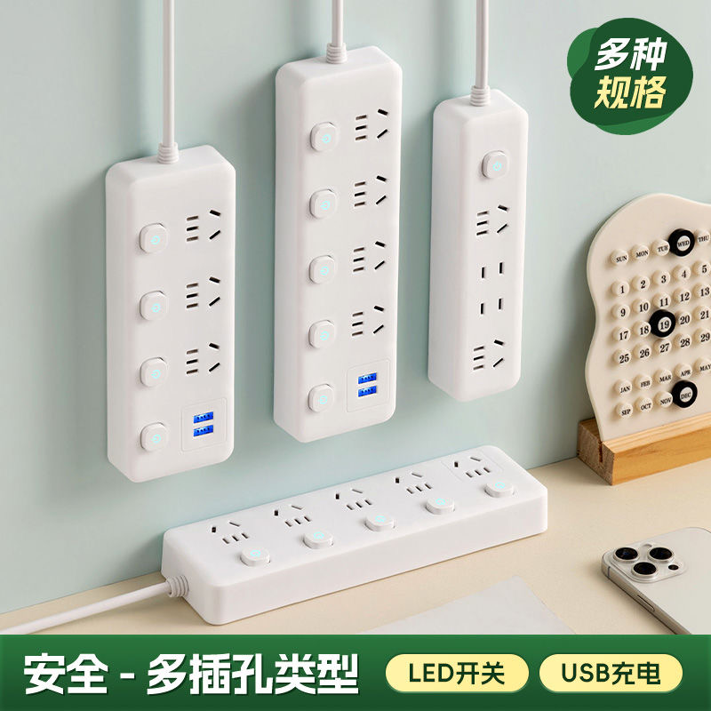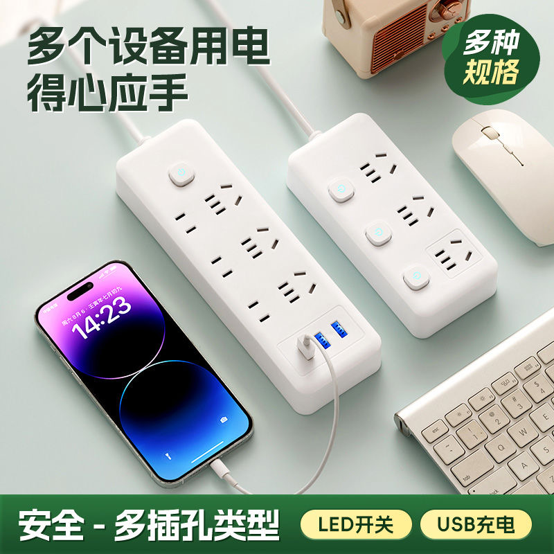 米用多功能插座家用插排插线板带线多孔拖线接线板带USB纯铜芯