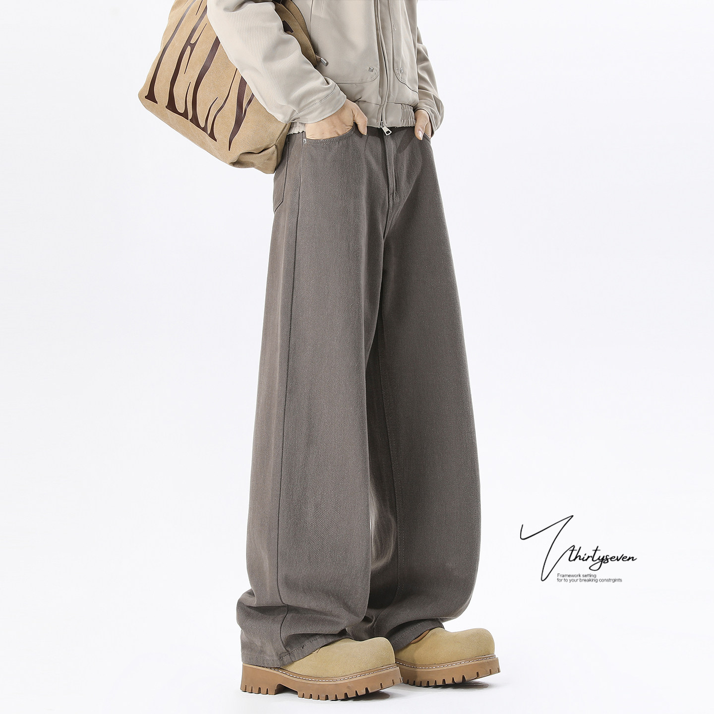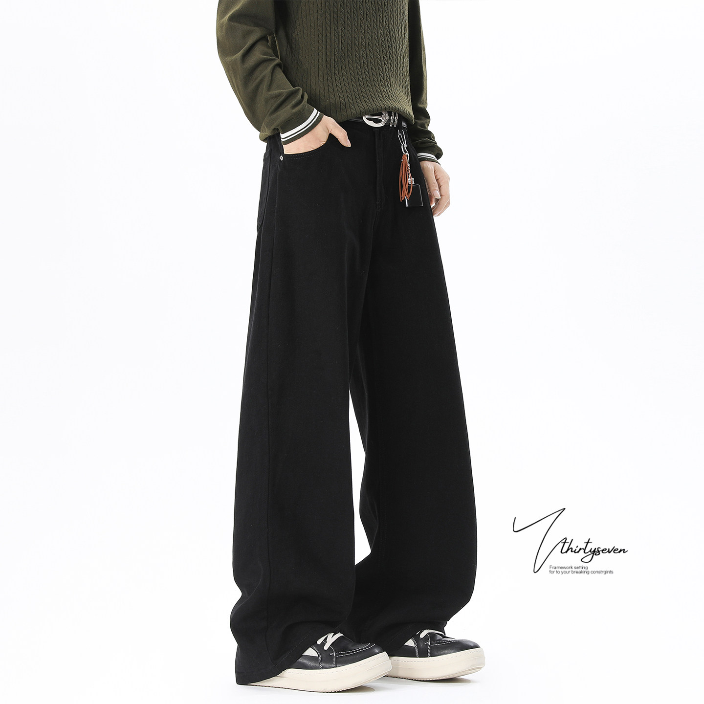V37美式复古黑色阔腿牛仔裤男秋冬高级感宽松垂感情侣休闲长裤子