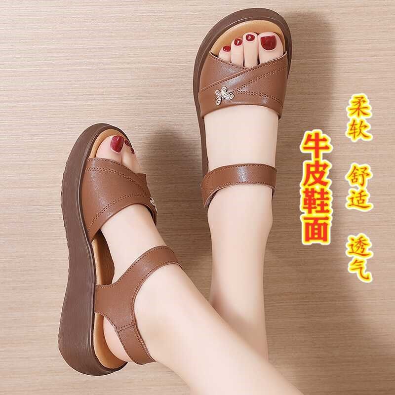 妈妈凉鞋夏季新款真皮平底舒适牛筋软底中老年大码坡跟防滑凉鞋女