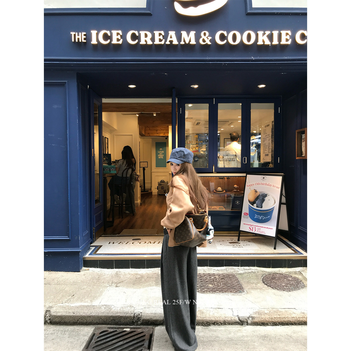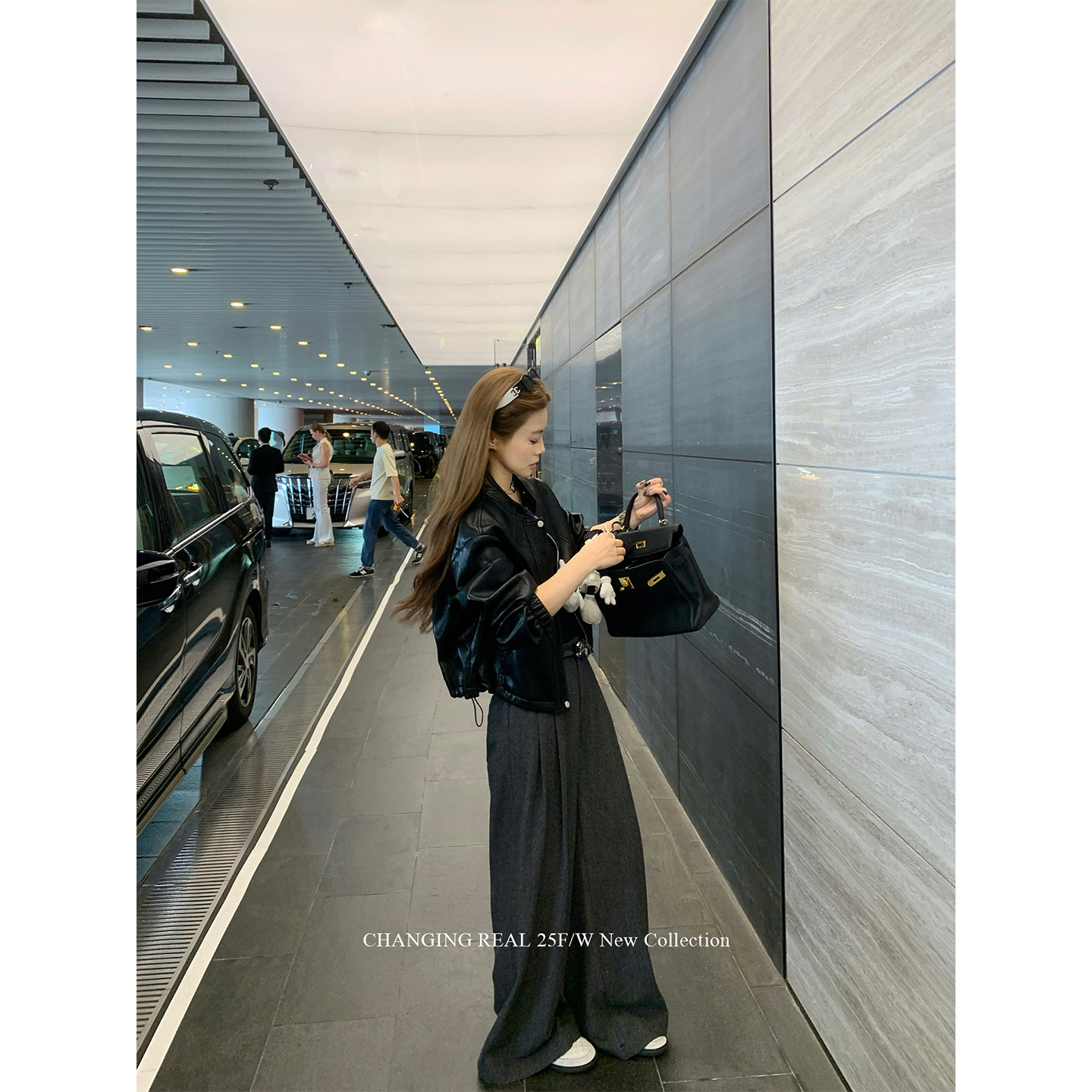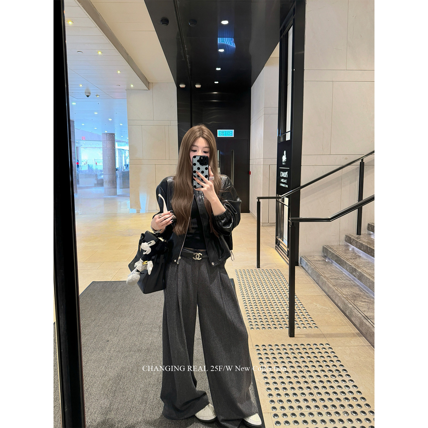 CHANGING REAL 薄雾潮汐 人字纹薄毛呢西装裤女质感宽松阔腿长裤