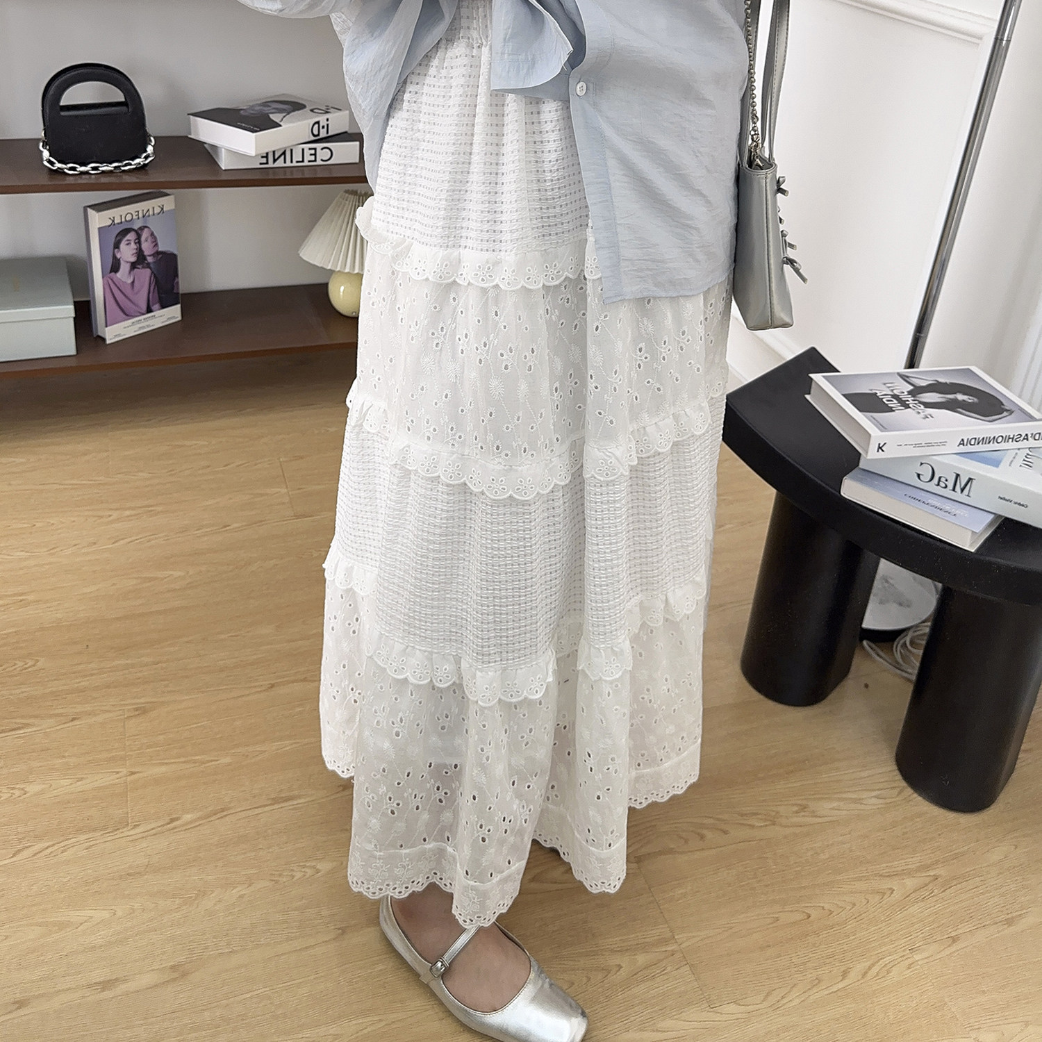 大码女装胖MM镂空木耳边设计感拼接花边高腰温柔风半身裙A字长裙