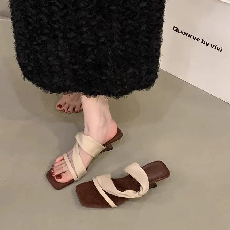 拼色复古辣妹风!方头绒面一字带坡跟拖鞋女夏季韩版露趾高跟凉鞋