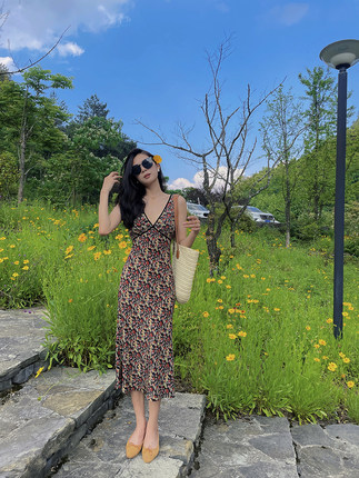小鱼自制法式复古真丝连衣裙 夏新深V性感显瘦吊带连衣裙度假裙