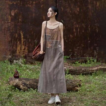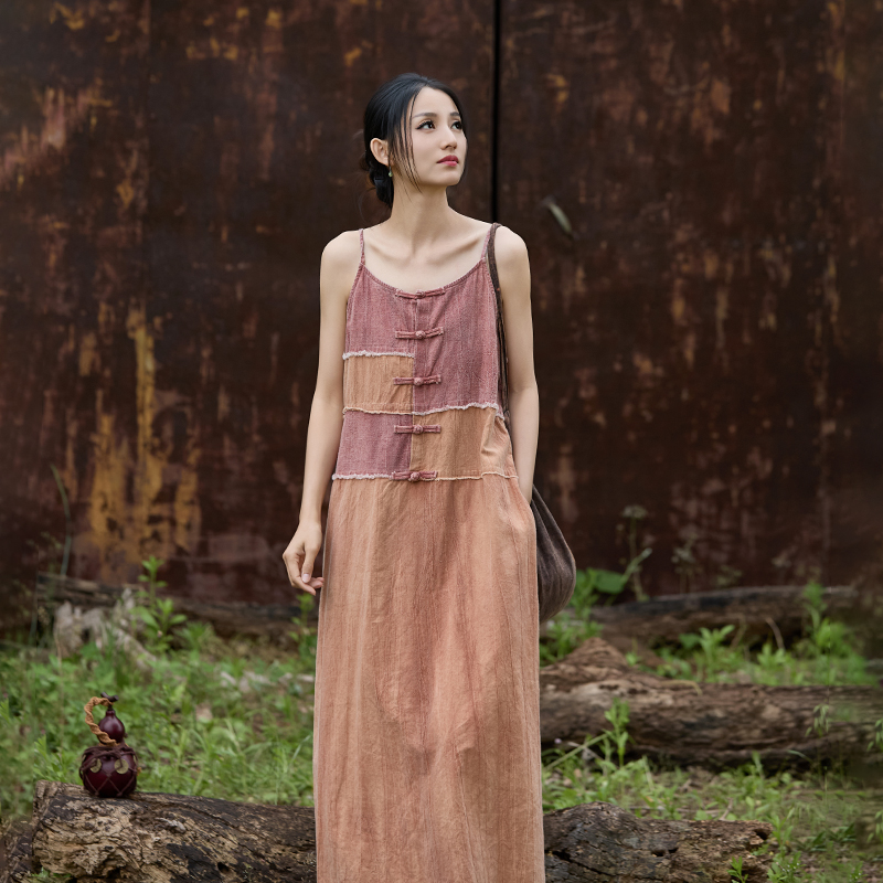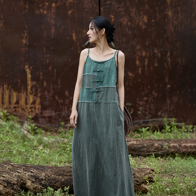 亚麻扎染长款吊带裙女原创新中式复古盘扣长裙垂感飘逸棉麻连衣裙