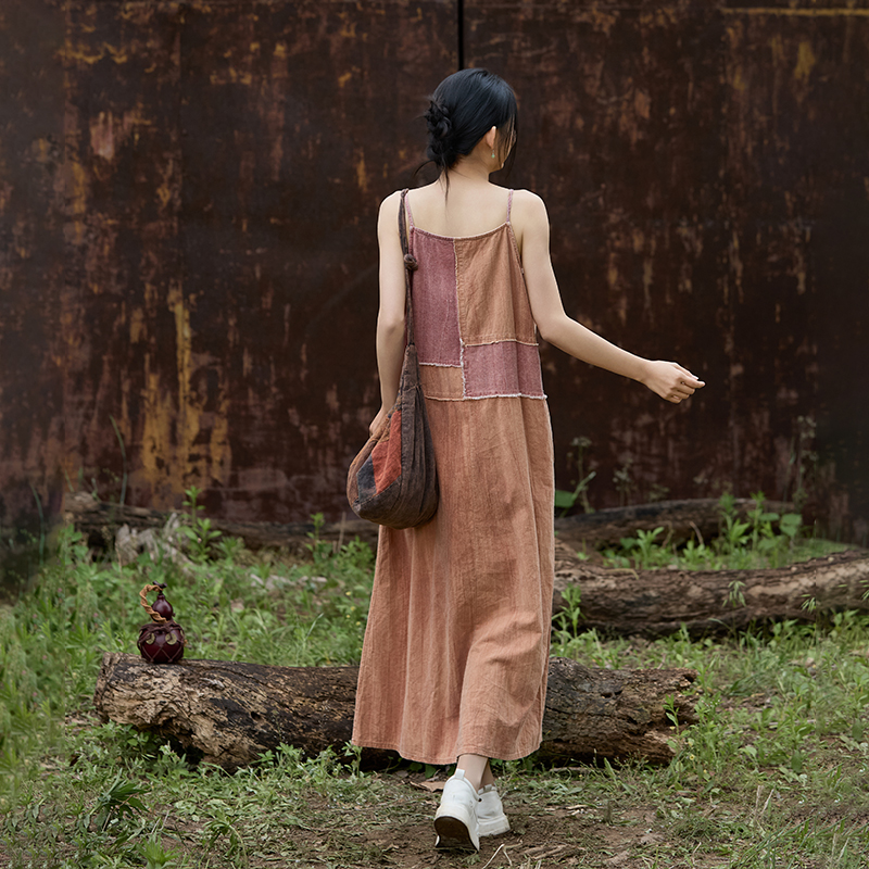 亚麻扎染长款吊带裙女棉麻连衣裙