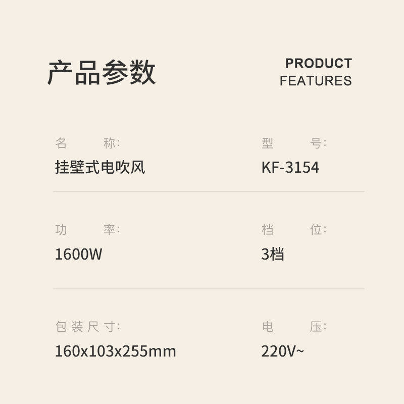 康夫3154挂壁式吹风机大功率1600w酒店电吹风机浴室家用恒温